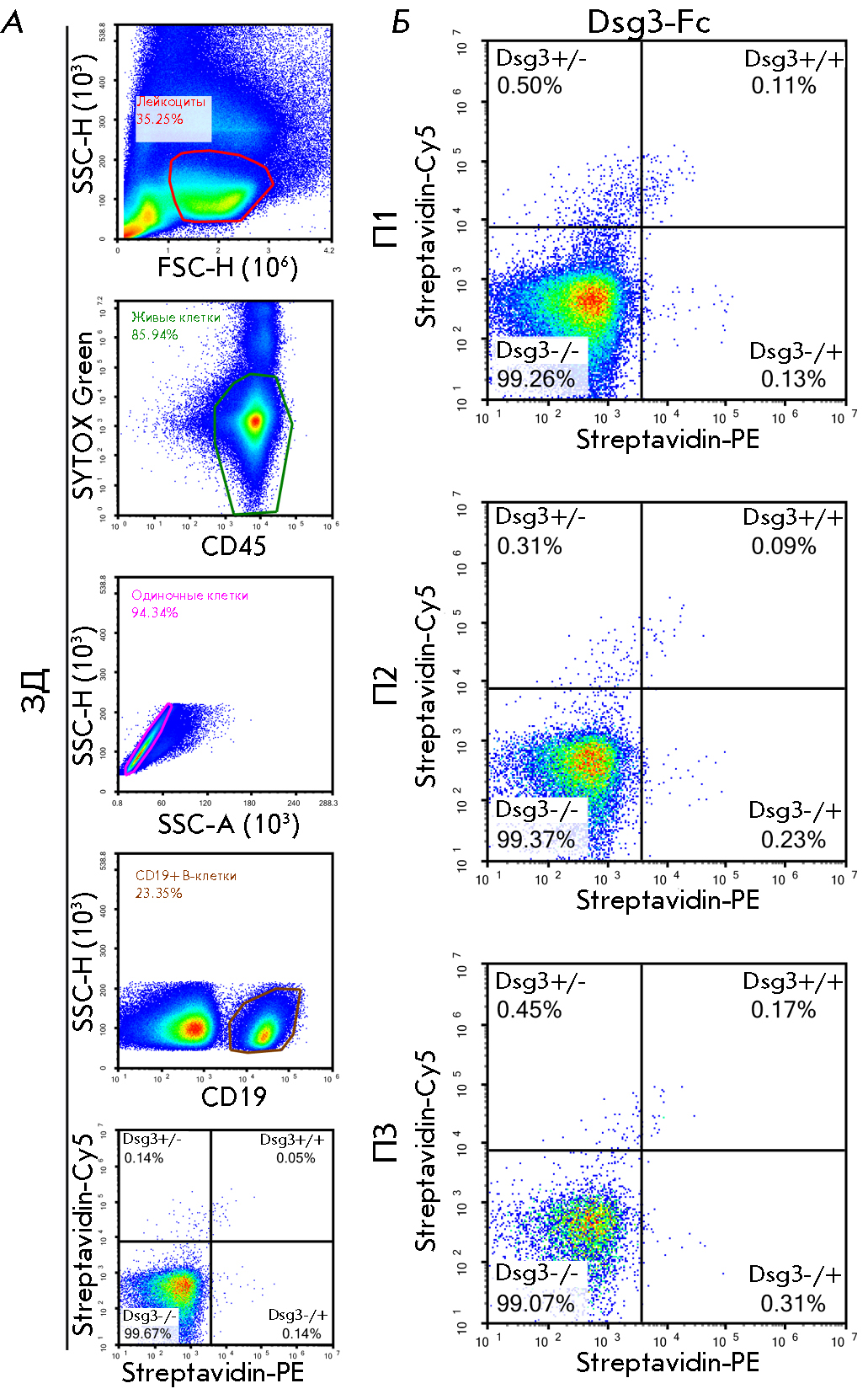 Рис. 2. Выбор параметров (А) и цитометрический анализ B-клеток, специфичных к полноразмерному Dsg3 (Б). Параметры граничных условий для графика в координатах Streptavidin-Cy5 и Streptavidin-PE выбирали таким образом, чтобы количество положительных событий в сегменте с «двойным положительным» сигналом (+/+) составляло 0.05% в контрольном образце (здоровый донор, ЗД)