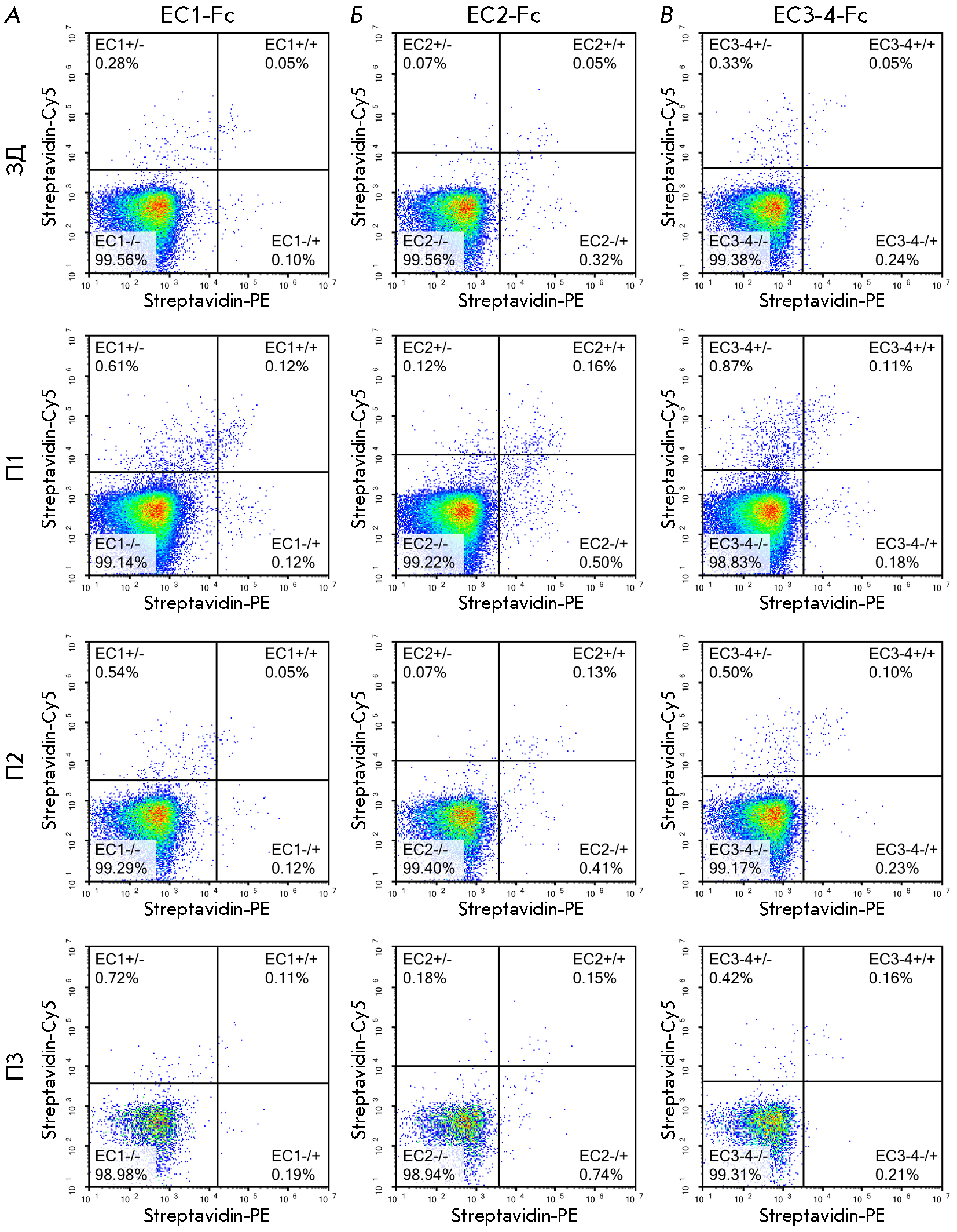 У пациента П1 выявлено наибольшее количество B-клеток, специфичных к домену EC2 (0.16%), при этом количество клеток к доменам EC1 и EC3-4 ниже – 0.12 и 0.11% соответственно. У пациента П2 отсутствовали EC1-специфичные клетки (на уровне контроля), при этом доля клеток к доменам EC2 и EC3-4 составила 0.13 и 0.10%. У пациента П3 доля B-клеток, специфичных ко всем доменам, была сравнимой с долей у пациента П1, однако наибольшей была доля В-клеток, специфичных к доменам EC2 и EC3-4 (0.15 и 0.16%).