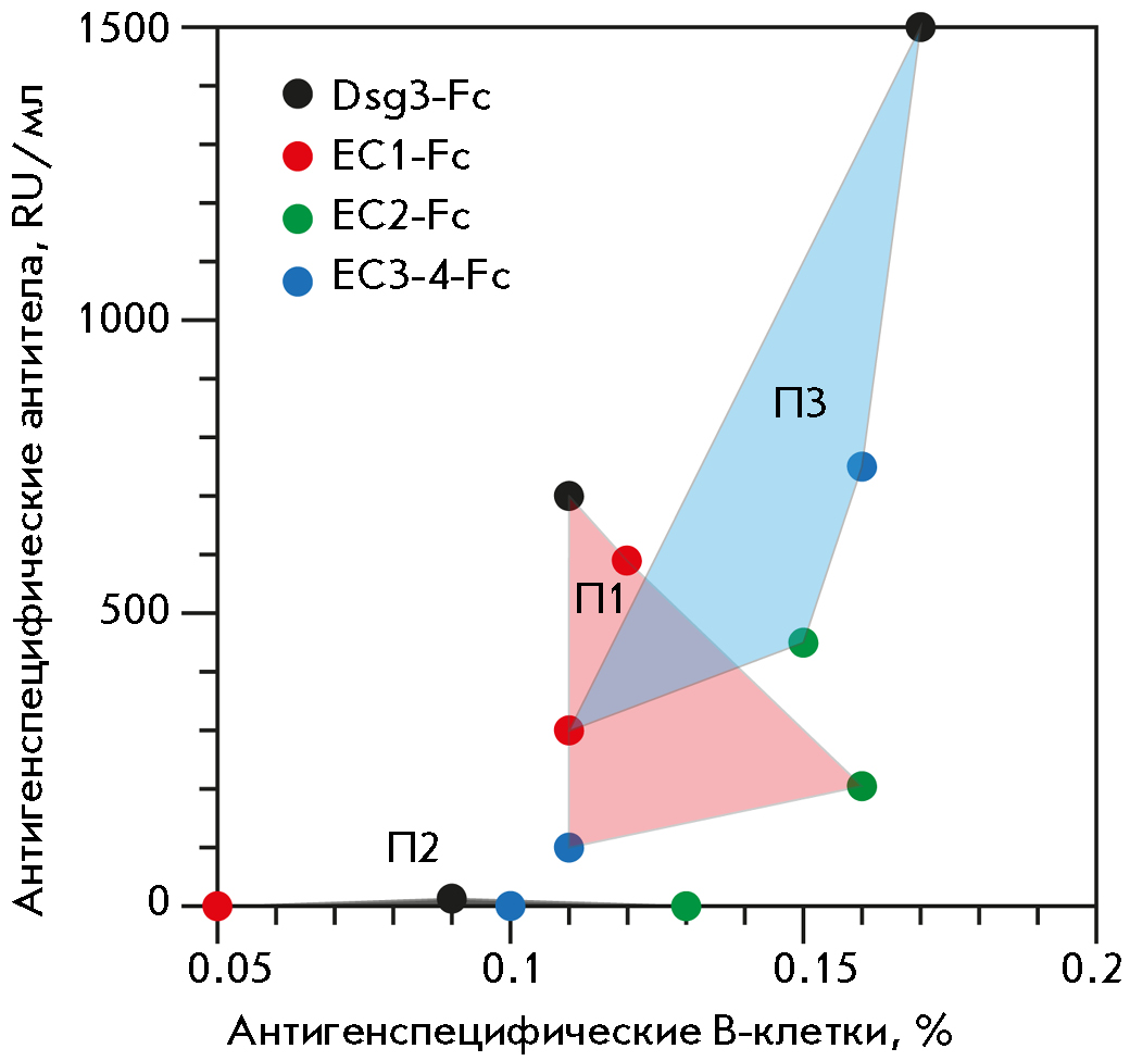 Согласно результатам, представленным на pис. 2Б, наибольшая доля B-клеток, специфичных к полноразмерному десмоглеину, обнаружена у пациента П3, наименьшая – у пациента П2, что в целом соотносится с результатами ИФА (табл. 1). Доля B-клеток, специфичных к различным доменам десмоглеина, у всех пациентов также различалась (рис. 3).