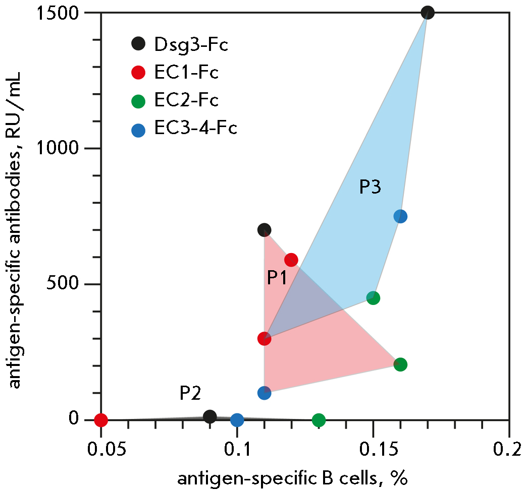 При этом доля аутореактивных B-клеток у пациентов с пузырчаткой составила 0.09–0.16%. Также обнаружен заметный уровень неспецифического окрашивания у здорового донора (0.05%), однако использование «двойного положительного» подхода к окрашиванию клеток позволило детерминировать профиль антигенспецифичности B-клеток у пациентов с пузырчаткой. Полученные результаты важны для разработки стратегии персонализированной терапии пузырчатки цитотоксическими иммунолигандами на основе рекомбинантных доменов десмоглеина, слитых с константным доменом иммуноглобулина человека. Вероятно, что пациент П2 будет нечувствителен к терапии EC1-Fc, в то же время можно ожидать элиминацию аутореактивных B-клеток при использовании EC2-Fc и EC3-4-Fc у пациентов П1 и П3 соответственно. Применение профилирования B-лимфоцитов у пациентов с аутоиммунными заболеваниями, в частности обыкновенной пузырчаткой, открывает широкие перспективы в выборе стратегии персонализированной терапии.