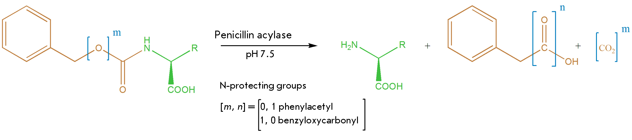 Fig. 1. Removal of phenylacetyl and benzyloxycarbonyl protecting groups catalyzed by penicillin acylases