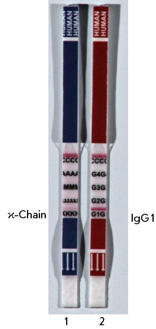 Fig. 3. Class assignment of C6D7-RBD hMAb.1 – Strip for determining the light chain type and immunoglobulin class.2 – Strip for determining the IgG subclass