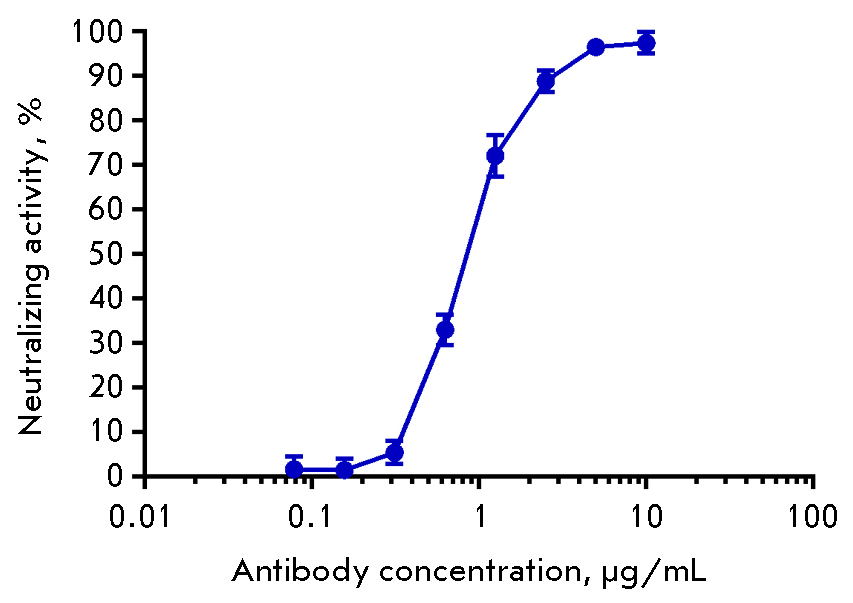 The virus-neutralizing activity of C6D7-RBD hMAb was evaluated using competitive ELISA. For this purpose, the recombinant RBD protein was immobilized on the wells of a 96-well polystyrene plate at a concentration of 1 μg/mL according to the above-described procedure. Then, the C6D7-RBD hMAb was added to the wells at concentrations of 10 to 0.078125 μg/mL in a twofold serial dilution step. The plate was incubated at 37°C for 1 h. After incubation, the wells were washed with PBS-TW three times. Then, recombinant human ACE-2 (fc-hace2, Invivogen) conjugated with horseradish peroxidase was added to the wells using a LYNX Rapid HRP Antibody Conjugation kit (Bio-Rad). The plate was incubated and washed using the same conditions. Then, 100 µL of a TMB developing solution was added to the wells. The reaction was evaluated based on the development of a blue color. The staining intensity was measured on a microplate spectrophotometer (Bio-Rad xMark) at a wavelength of 655 nm. The mean background optical density (control of the wells without RBD immobilization, which is equivalent to the RBD completely blocked by antibodies) was considered as 100% neutralizing activity. The mean optical density of the control wells where ACE-2–HRP interacted with RBD in the absence of antibodies was considered as a lack of neutralizing activity (0%). The control values were used to generate a linear function in order to quantify absorbance in the experimental wells with varying antibody amounts as the percentage of neutralizing activity.