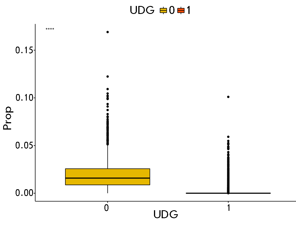 5. Fig. 4. Distribution of the relative content of additional components in the ADMIXTURE analysis between samples from the Allen Ancient DNA Resource V44.3 panel treated with UDG (1) - 2,376 samples and without treatment (0) - 908 samples. Prop – the proportion of admixtures