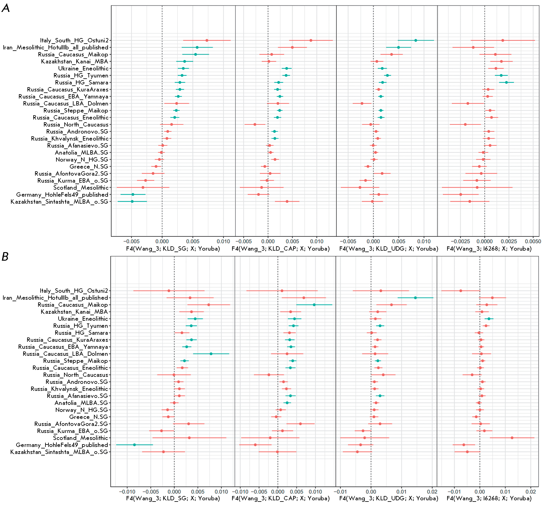 Fig. 5. F4 statistics in the F(Wang_3, Y;X, Yoruba) configuration. The reliable metrics for |z| > 3 are colored in blue. (A) – F4 calculated for all SNPs from the 1240k panel. (B) – F4 calculated for transversions only
