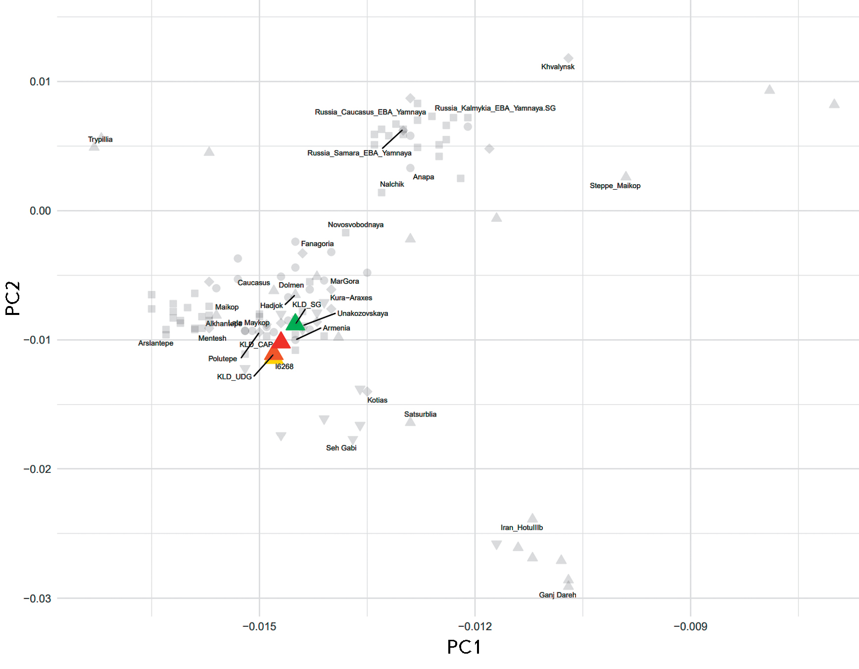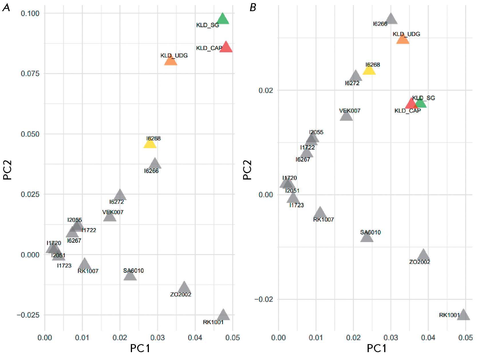 Fig. 7. Principal component analysis (PCA) for KLD_SG, KLD_CAP, KLD_UDG, I6268 (highlighted in color), and other Caucasian samples (shown in grey) calculated for all SNPs from the 1240k panel (A) and transversions only (B)
