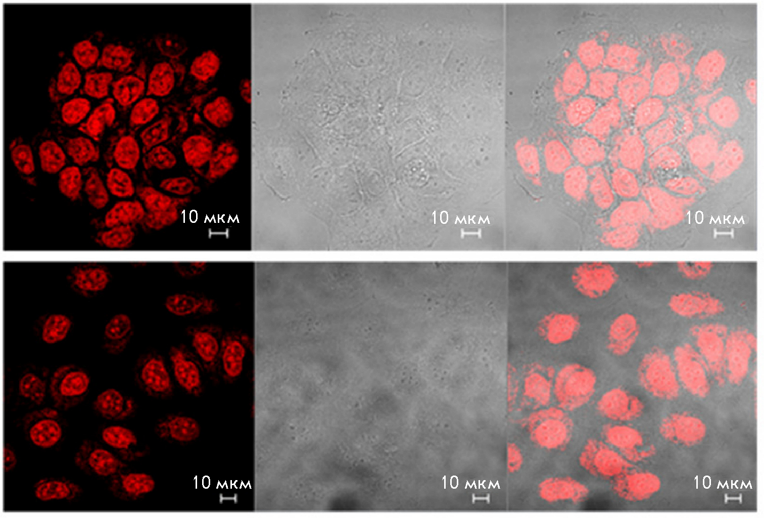 Рис. 2. Конфокальная микроскопия живых клеток линии U2OS, инкубированных с красителем DAOTA-M2, демонстрирующая ядерную локализацию G-квадруплексов (сверху – сигнал флуоресценции, в центре – наблюдение в светлом поле, снизу – наложение двух сигналов). Воспроизведено из [40] согласно лицензии CC BY 4.0 (http://creativecommons.org/licenses/by/4.0/)