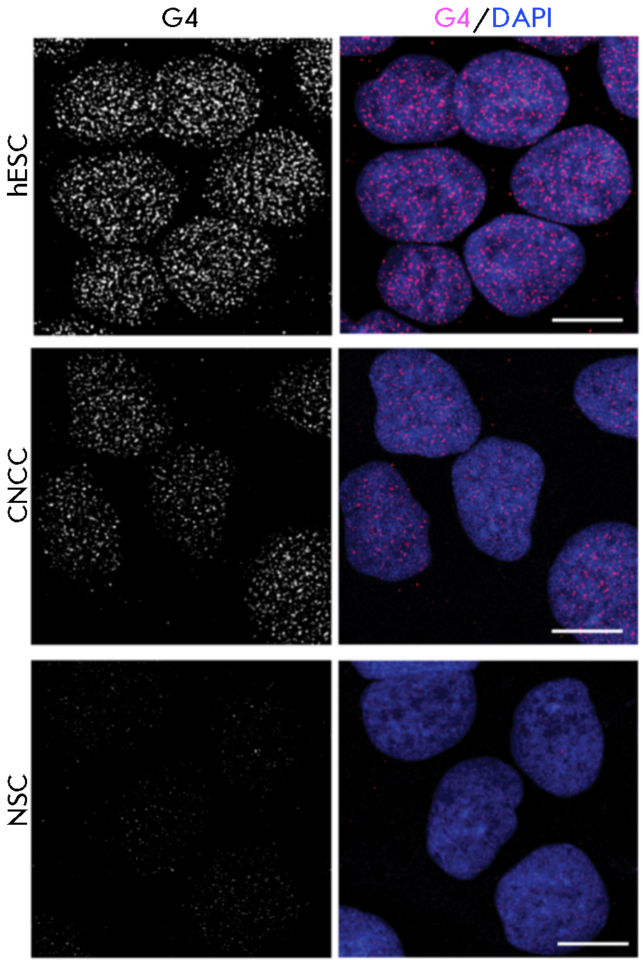 Fig. 3. An immunofluorescence microscopy image of fixed pluripotent embryonic stem cells (hESCs), cranial neural crest cells (CNCCs), and neural stem cells (NSCs) labeled with G-quadruplex-specific antibodies BG4 after treatment with RNase (secondary antibodies labeled with fluorescent dye AlexaFluor 488). On the left-hand side, only the quadruplexes are visualized; while on the right-hand side, the nuclei are stained blue due to the contrast with the DNA dye DAPI. The scale bar is 10 μm. Reproduced from [54] under the CC 4.0 license (http://creativecommons.org/licenses/by/4.0/)