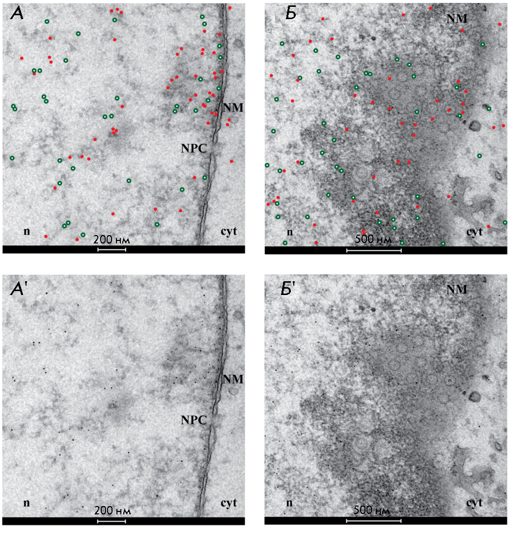 Рис. 5. Иммуноэлектронная микроскопия инфицированных вирусом простого герпеса типа 1 (ВПГ-1) клеток, фиксированных через 15 ч после инфицирования и инкубированных с анти-G-квадруплексным антителом (1H6) и анти-ICP8-сывороткой. Первичные антитела 1H6 и к ICP8 детектированы с помощью золотых частиц диаметром 5 и 10 нм соответственно. Для улучшения четкости изображения золотые частицы подсвечены красными точками (показывающими G-квадруплексы) и зелеными кружками (показывающими ICP8) на А и Б. Исходные изображения приведены на панелях A’ и Б’. (A–A’) G-квадруплексы и ICP8 концентрируются вблизи ядерной мембраны (NM), где находится комплекс ядерной поры (NPC). Выход из ядра через комплекс ядерной поры является одним из путей, используемых капсидами ВПГ-1 для выхода из ядра (n) в цитоплазму (cyt). (Б–Б’) G-квадруплексы и ICP8 кластеризуются рядом с ядерной мембраной, где отпочковываются свежесформированные вирионы. Воспроизведено из [61] согласно лицензии CC BY 4.0 (http://creativecommons.org/licenses/by/4.0/)