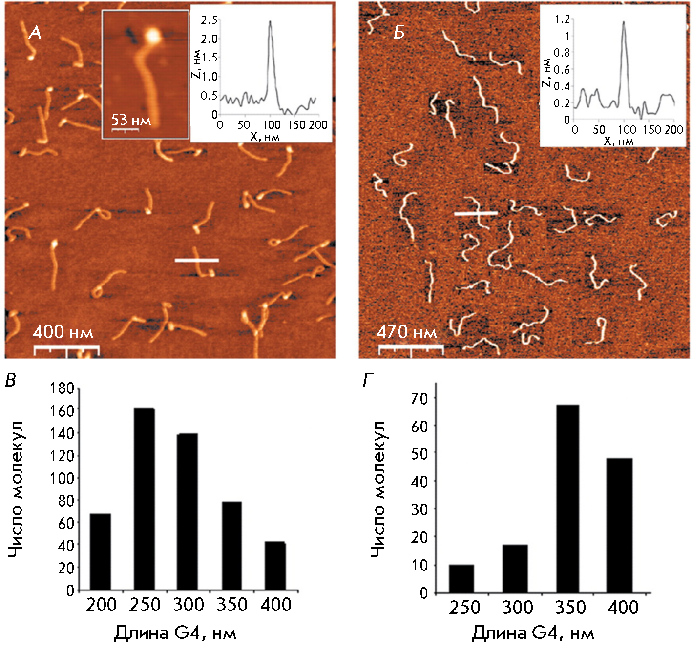 Рис. 6. Сравнение тетра- и мономолекулярных G-квадруплексов. АСМ-изображения тетрамолекулярных (вставка: увеличенный тетрамолекулярный комплекс) (А) и мономолекулярных (Б) G-квадруплексов. Тетрамолекулярные G-квадруплексы приготовлены с использованием комплекса четырех молекул 5’-биотин-поли(dG)-поли(dC) длиной 1400 п.н., связанных с авидином. Мономолекулярные G-квадруплексы приготовлены с использованием G-цепи длиной 5500 оснований. Молекулы обоих типов нанесены на слюду при одинаковых условиях. Статистический анализ контурных длин тетрамолекулярных (В) и мономолекулярных (Г) G-квадруплексов. Воспроизведено из [95] согласно лицензии CC BY 4.0 (http://creativecommons.org/licenses/by/4.0/)