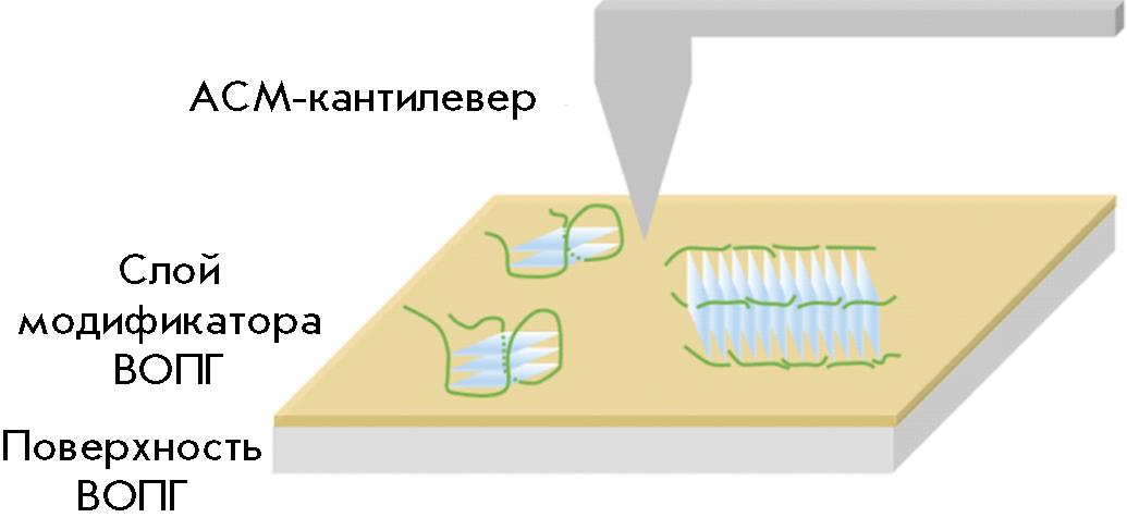 Рис. 8. Схематичное представление поверхности образца для АСМ-исследования квадруплексов и квадруплекссодержащих структур на поверхности ВОПГ, модифицированного GM