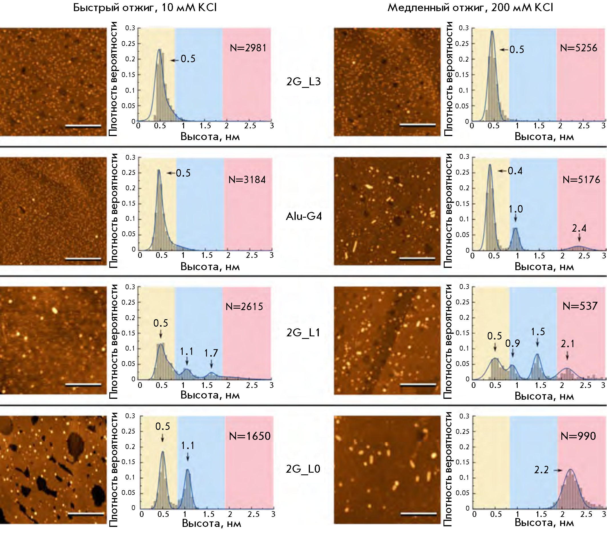 Рис. 9. АСМ-изображения и соответствующие гистограммы распределения по высотам двухтетрадных G-квадруплексов, сформированных после быстрого отжига в присутствии 10 мМ KCl (слева) и медленного отжига в присутствии 200 мМ KCl (справа). Масштабная метка 100 нм. Воспроизведено из [112] согласно лицензии CC BY 4.0 (http://creativecommons.org/licenses/by/4.0/)