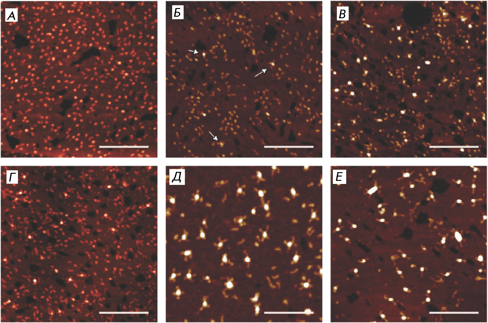 Рис. 10. АСМ-изображения наноструктур на основе i-мотивов, образованных следующими олигонуклеотидными последовательностями при pH 5.5: C2T25 (A); C5T25 (Б); C7T25 (В); C9T25 (Г); C12T25 (Д); C25T25 (Е). Масштабная метка 100 нм. Воспроизведено из [114] согласно лицензии CC BY-NC 3.0 (https://creativecommons.org/licenses/by-nc/3.0/)