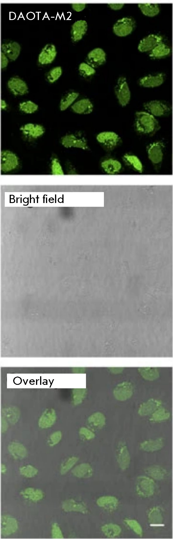 Fig. 2. A confocal microscopy image of living U2OS cells incubated with the DOTA-M2 dye, demonstrating nuclear localization of G-quadruplexes (top – fluorescence signal; center – bright field observation; bottom – superposition of two signals). Reproduced from [40] under the CC 4.0 license (http://creativecommons.org/licenses/by/4.0/)
