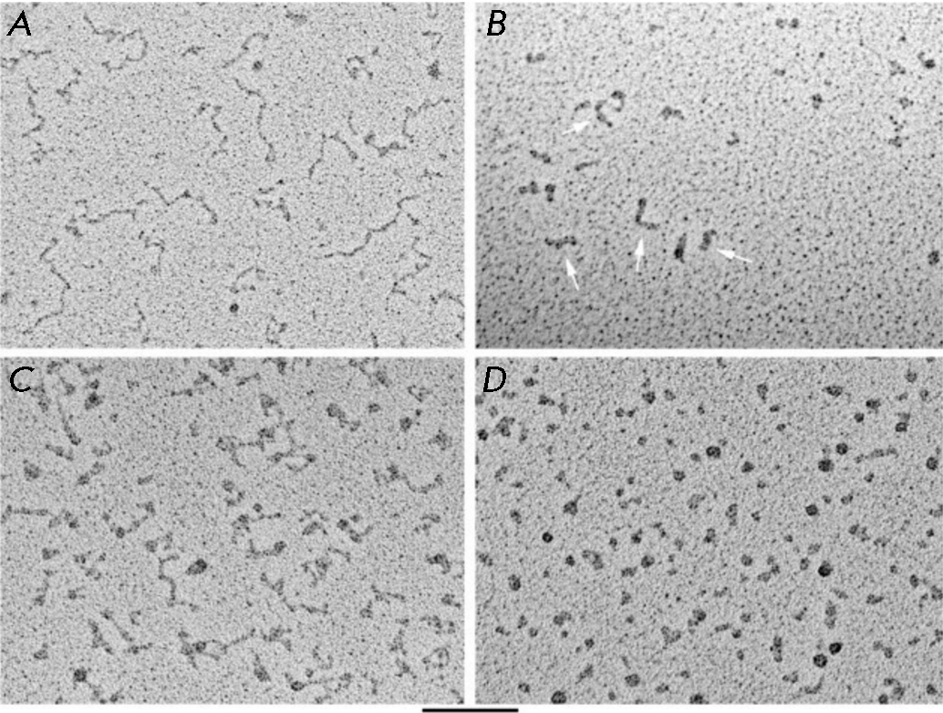 Fig. 4. Visualization of C- and G-rich telomeric transcripts. C-rich (A) and G-rich (B) RNA molecules in 100 mM KCl were deposited for EM on thin carbon substrates, dehydrated, and shaded with tungsten on a rotating substrate. C-rich RNAs look like elongated strands with nodes. G-rich RNAs look like a mixture of balls and sticks (arrows). The rod thickness is significantly greater than that of C-rich or duplex RNAs. C-rich (C) and G-rich (D) RNA molecules are deposited from 10 mM KCl in the same way as in (A) and (B). C-rich RNA looks straightened with nodes, while G-rich RNA is mainly ball-shaped. The scale bar is 100 nm. Reproduced from [60] under the CC 4.0 license (http://creativecommons.org/licenses/by/4.0/)