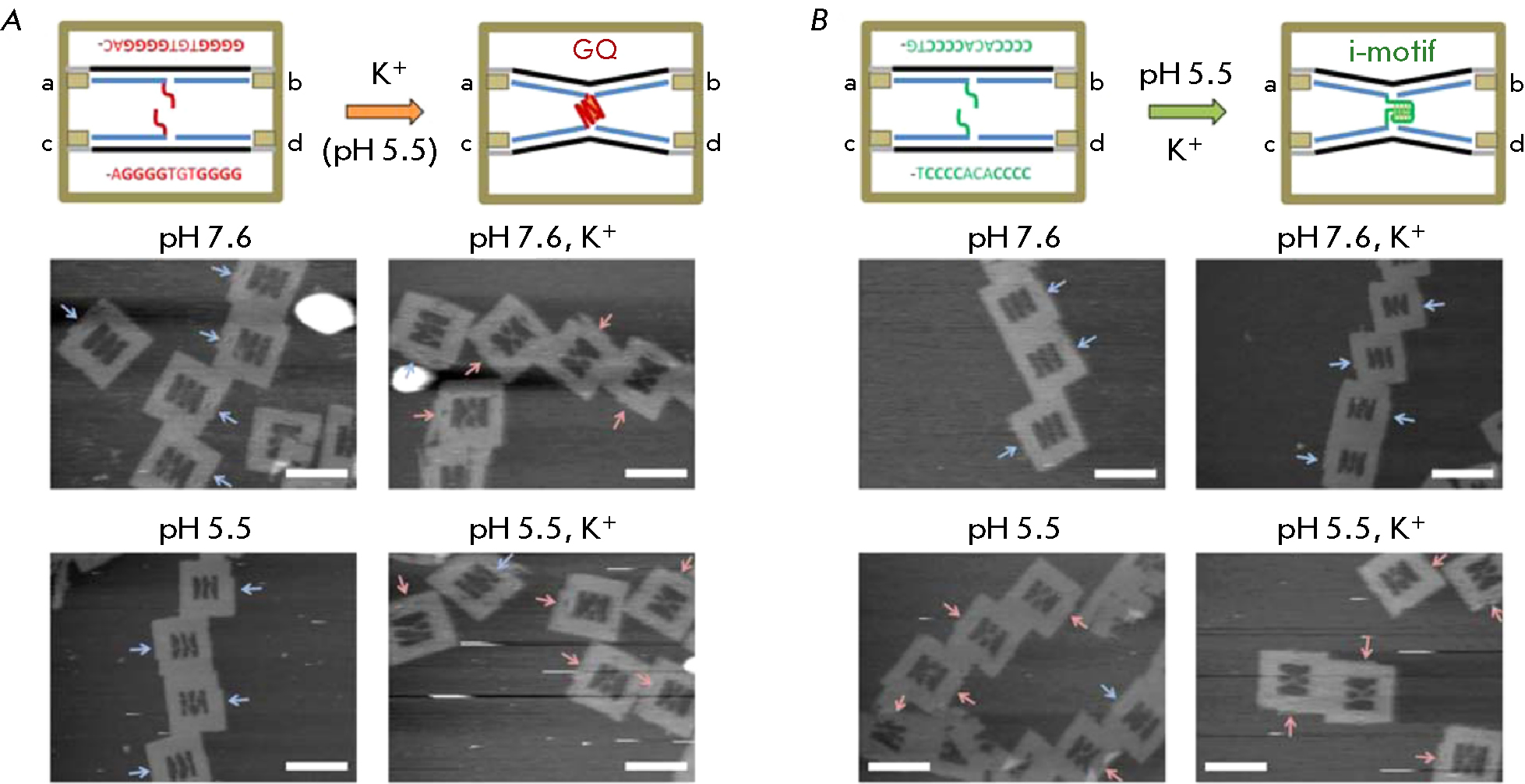 Fig. 7. Observation of the formation of a separate G-quadruplex and i-motif. (A) – AFM images of DNA frames containing the G-tracts required for the formation of an interstrand G-quadruplex in the presence of K+. (B) – AFM images of DNA frames containing the C-tracts required for the formation of an interstrand i-motif in an acidic medium. The blue and red arrows show disconnected and connected (X-shaped) threads, respectively. The scale bars are 100 nm. Adapted with permission from [105]. Copyright (2015) American Chemical Society
