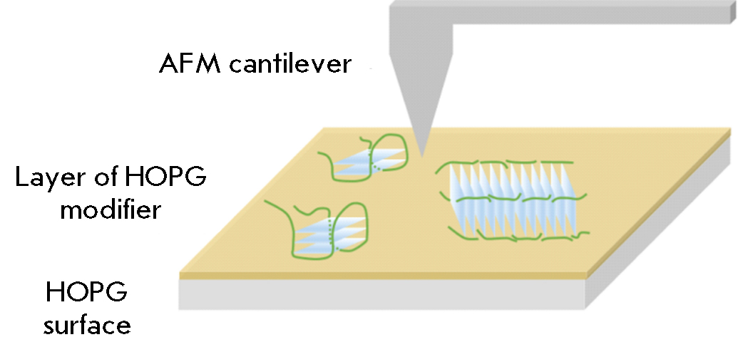 Fig. 8. Schematic representation of the sample surface for AFM studies of the quadruplexes and quadruplex-containing structures on the surface of the GM modified HOPG