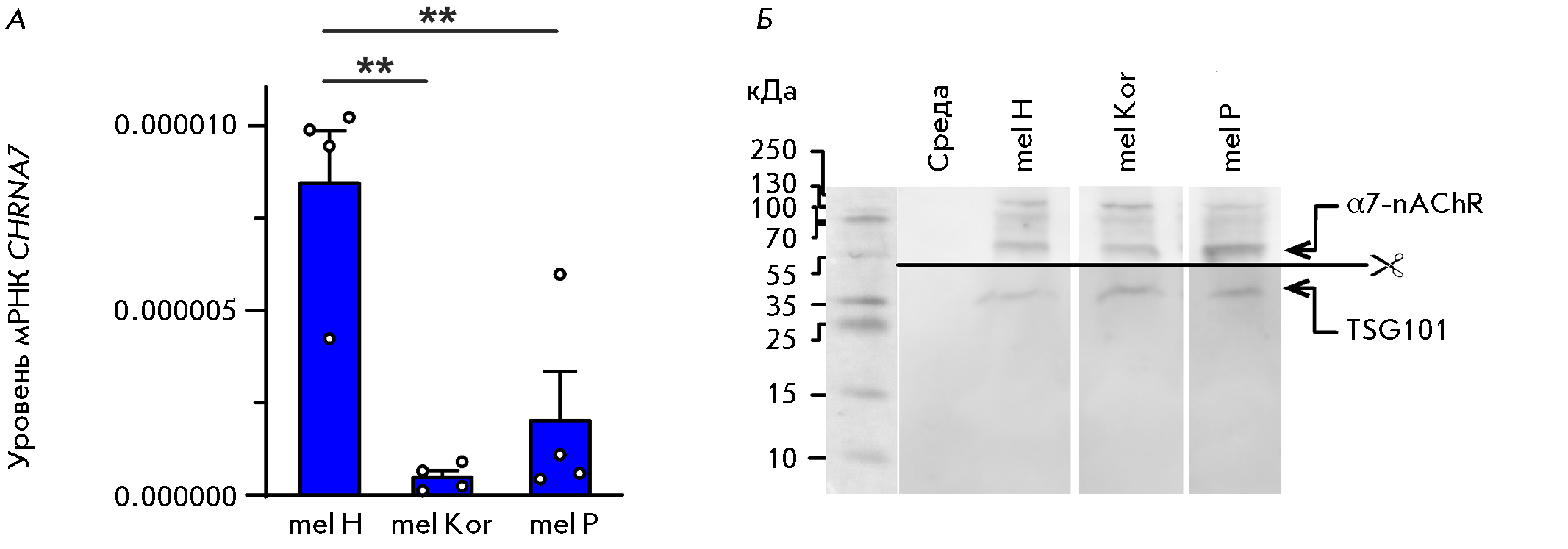 Рис. 1. Анализ экспрессии α7-nAChR в везикулах, секретируемых клетками метастатической меланомы. А – анализ экспрессии гена CHRNA7 в везикулах клеток линий mel H, mel Kor и mel P. Данные ПЦР в реальном времени нормированы на экспрессию мРНК S18 и приведены как среднее ± среднеквадратичная ошибка (n = 4). ** (p < 0.01) означает статистически значимое отличие групп данных согласно тесту Оne-way ANOVA/Tukey. Б – анализ содержания α7-nAChR в везикулах клеток mel H, mel Kor и mel P с помощью Вестерн-блотинга. Белок TSG101 использовали в качестве экзосомального маркера