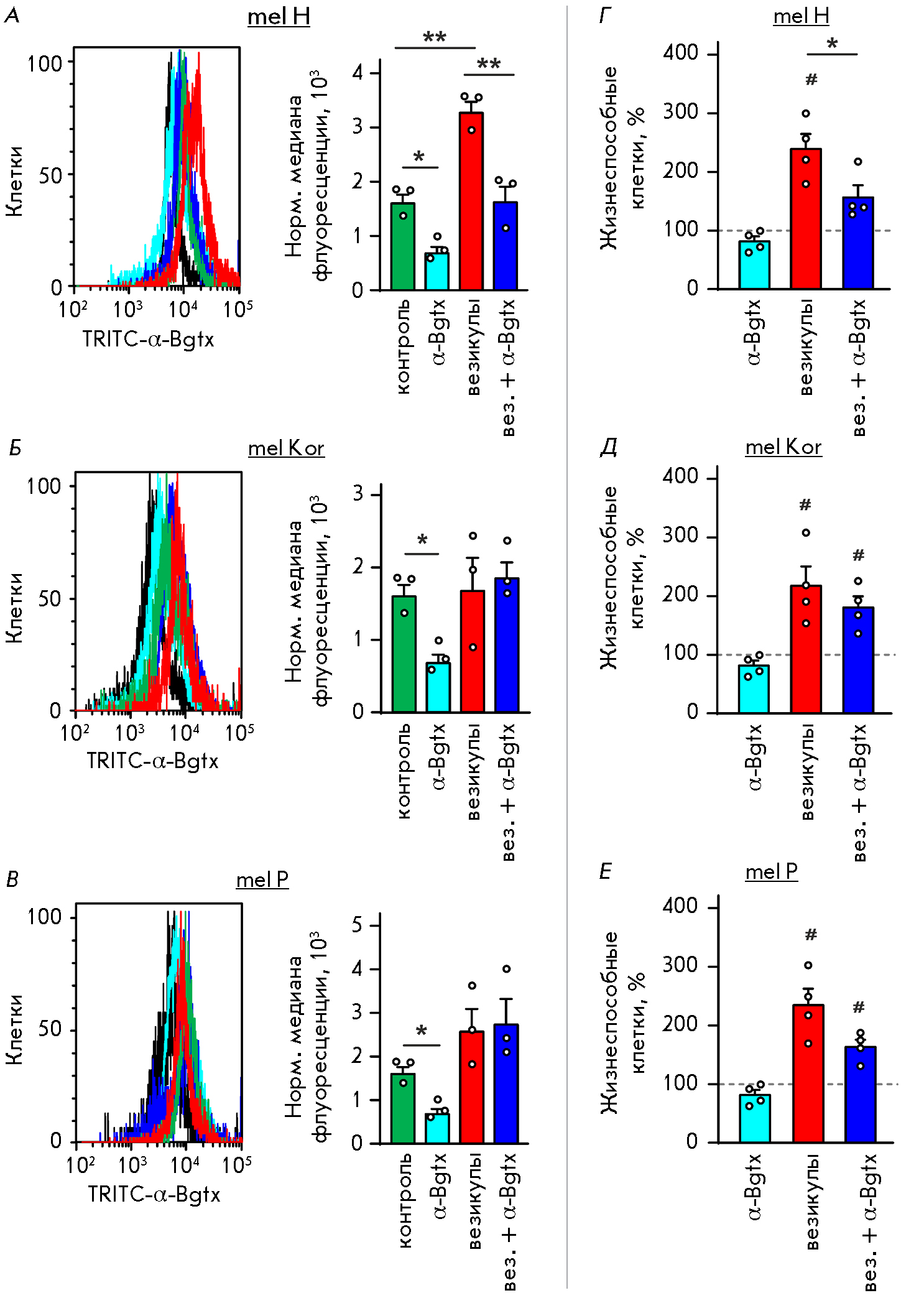 Рис. 2. Анализ влияния везикул, секретируемых клетками метастатической меланомы, и α-Bgtx на экспрессию α7-nAChR и пролиферацию кератиноцитов. А–В – экспрессия α7-nAChR на поверхности нормальных кератиноцитов, инкубированных с внеклеточными везикулами клеток линий mel H (A), mel Kor (Б) и mel P (В) и/или α-Bgtx. Данные приведены как нормализованная медиана флуоресценции ± среднеквадратичная ошибка (n = 3). * (p < 0.05) и ** (р < 0.01) означают статистически значимые различия между группами данных согласно тесту Оne-way ANOVA/Tukey. Г–Е – влияние везикул клеток линий mel H (Г), mel Kor (Д) и mel P (Е) и/или α-Bgtx на пролиферацию нормальных кератиноцитов. Данные представлены как % от контроля (необработанные клетки, пунктирная линия) ± среднеквадратичная ошибка (n = 4). # (р < 0.05) означает значимое отличие от контроля согласно Оne-sample t-тесту. *(p < 0.05) означает достоверное различие между группами данных согласно тесту Оne-way ANOVA/Tukey