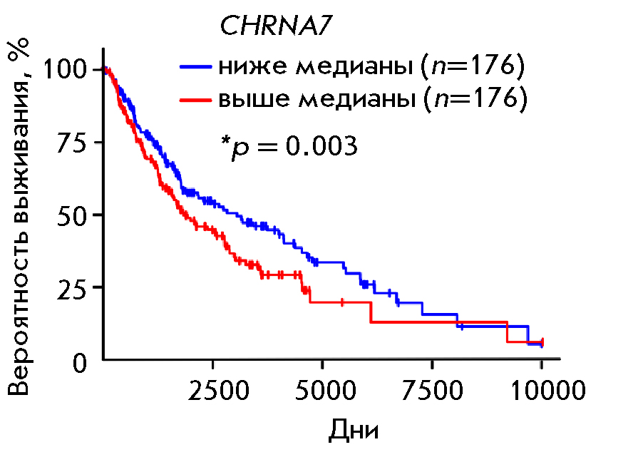 Корреляцию уровня экспрессии CHRNA7 у пациентов с метастатической меланомой из базы данных TCGA (исследование SKCM) с их выживаемостью анализировали при помощи программы Xena [12].