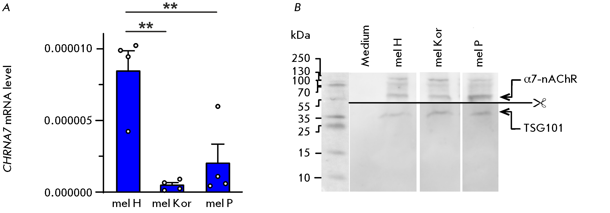 Fig. 1. Analysis of the α7-nAChR expression in extracellular vesicles derived from metastatic melanoma cells. (А) – Analysis of the CHRNA7 expression in extracellular vesicles derived from mel H, mel Kor, and mel P cells. Expression of mRNA was assayed by real-time PCR and normalized to the S18 ribosomal RNA. The data are presented as the mean mRNA level ± SEM (n = 4). ** (p < 0.01) indicates a significant difference between the data groups according to one-way ANOVA, followed by the Tukey’s post hoc test. (B) – Analysis of α7-nAChR protein expression in extracellular vesicles derived from mel H, mel Kor, and mel P cells by Western blotting. TSG101 was used as an exosomal marker