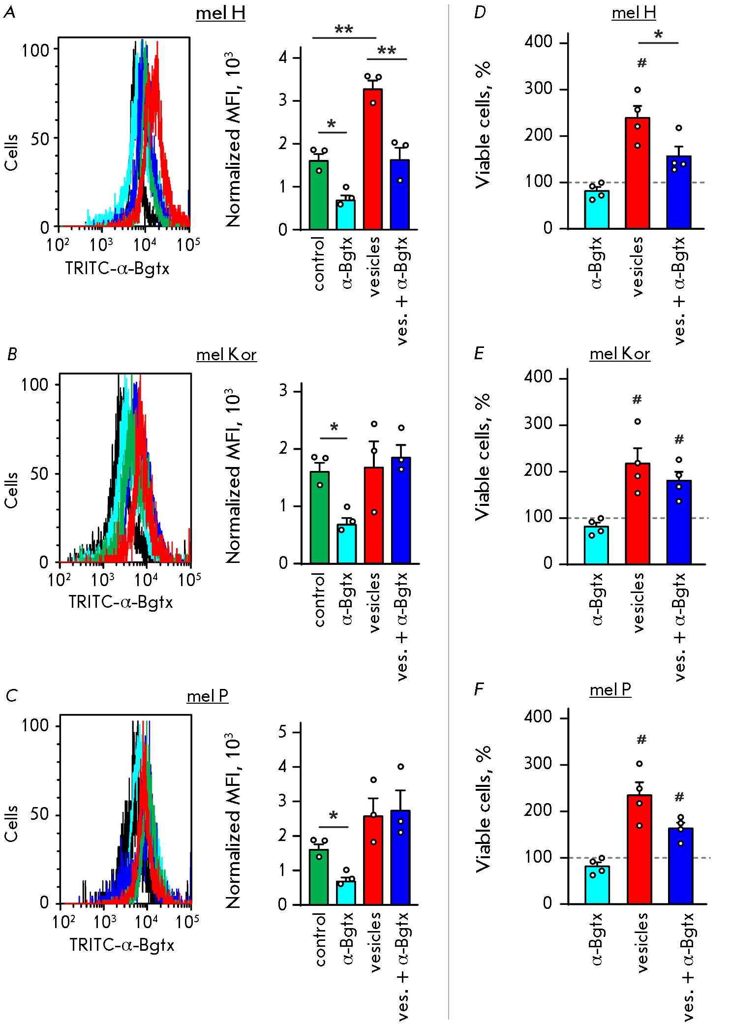 Fig. 2. Analysis of the effects of extracellular vesicles secreted by metastatic melanoma cells and α-Bgtx on the α7-nAChR expression and keratinocyte proliferation. А–C – Expression of α7-nAChR on the surface of normal keratinocytes incubated in the presence of extracellular vesicles derived from mel H (A), mel Kor (B), and mel P (C) cells and/or α-Bgtx. The data are presented as normalized median fluorescence (MFI) ± SEM (n = 3). * (p < 0.05) and ** (р < 0.01) indicate a significant difference between the data groups according to one-way ANOVA, followed by the Tukey’s post hoc test. D–F – The effects of extracellular vesicles derived from mel H (D), mel Kor (E), and mel P (F) cells and/or α-Bgtx on the proliferation of normal keratinocytes. The data are % of untreated cells ± SEM (n = 4). # (р < 0.05) indicates a significant difference from the untreated cells according to the one-sample t-test. * (p < 0.05) indicates a significant difference between the data groups according to one-way ANOVA, followed by the Tukey post hoc test