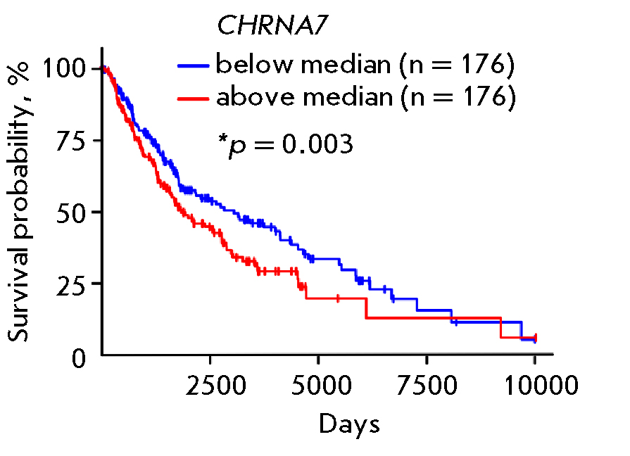Fig. 3. Bioinformatic analysis of the correlation between the survival of patients with metastatic melanoma and the CHRNA7 expression level. Patients were divided into two groups with the gene expression levels above and below the median value. Statistical analysis of patient survival was performed by the Kaplan–Meier method using the log-rank test