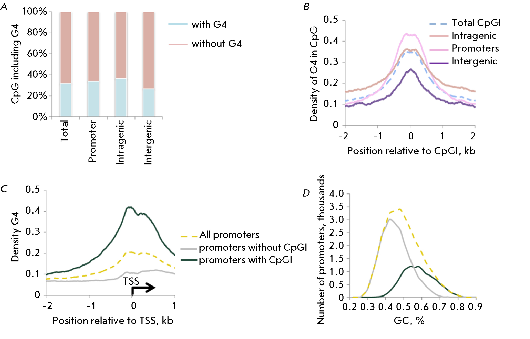 Fig. 4. Distribution of potential G4 sequences in CpG islands. (A) The proportion of CpG islands with G4, (B) the distribution density of G4 near CpG islands depending on the localization in the genome. (C) G4 density and (D) GC composition in promoter regions depending on the presence of CpG islands
