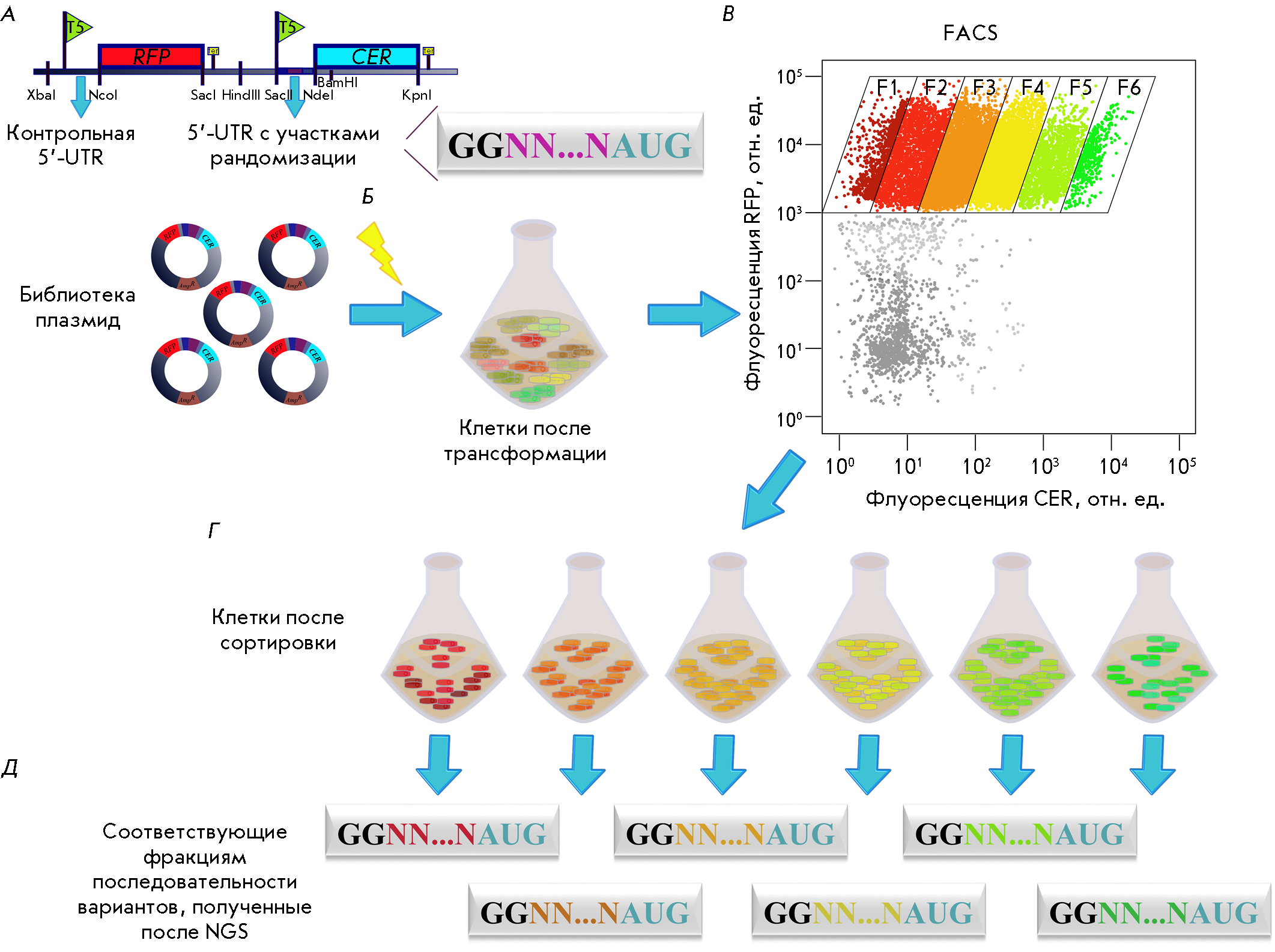 С целью определения влияния какого-либо фактора или набора факторов на уровень экспрессии того или иного гена часто используют тысячи репортерных конструкций, перебирающих различные варианты промоторов, 5’-нетранслируемых областей, а также отдельных участков в них, включая сайты посадки рибосомы (RBS), предшествующие им области (standby sites) или следующие за ними спейсерные участки, начальных «разгонных» участков кодирующей области (ramp region), по отдельности или одновременно (табл. 1). Как правило, такие плазмиды содержат два гена флуоресцентных белков: первый из них выступает в роли сенсора, экспрессия которого чувствительна к вариабельным участкам, а второй используется в качестве неизменного внутреннего контроля. Полученными наборами конструкций трансформируют штамм бактерий, подходящий для последующей экспрессии и сортировки. Далее с помощью проточной цитометрии оценивают интенсивности флуоресценции двух белков в пуле клеток и формируют группы/фракции клеток с приблизительно одинаковым отношением измеренных уровней флуоресценции этих белков. После наращивания количества собранных клеток из них выделяют плазмиды, вариабельный участок которых амплифицируют и подвергают высокопроизводительному секвенированию с целью определения последовательностей ДНК/РНК, попавших в конкретную фракцию и обеспечивающих тот или иной уровень экспрессии репортерного гена (рис. 3).