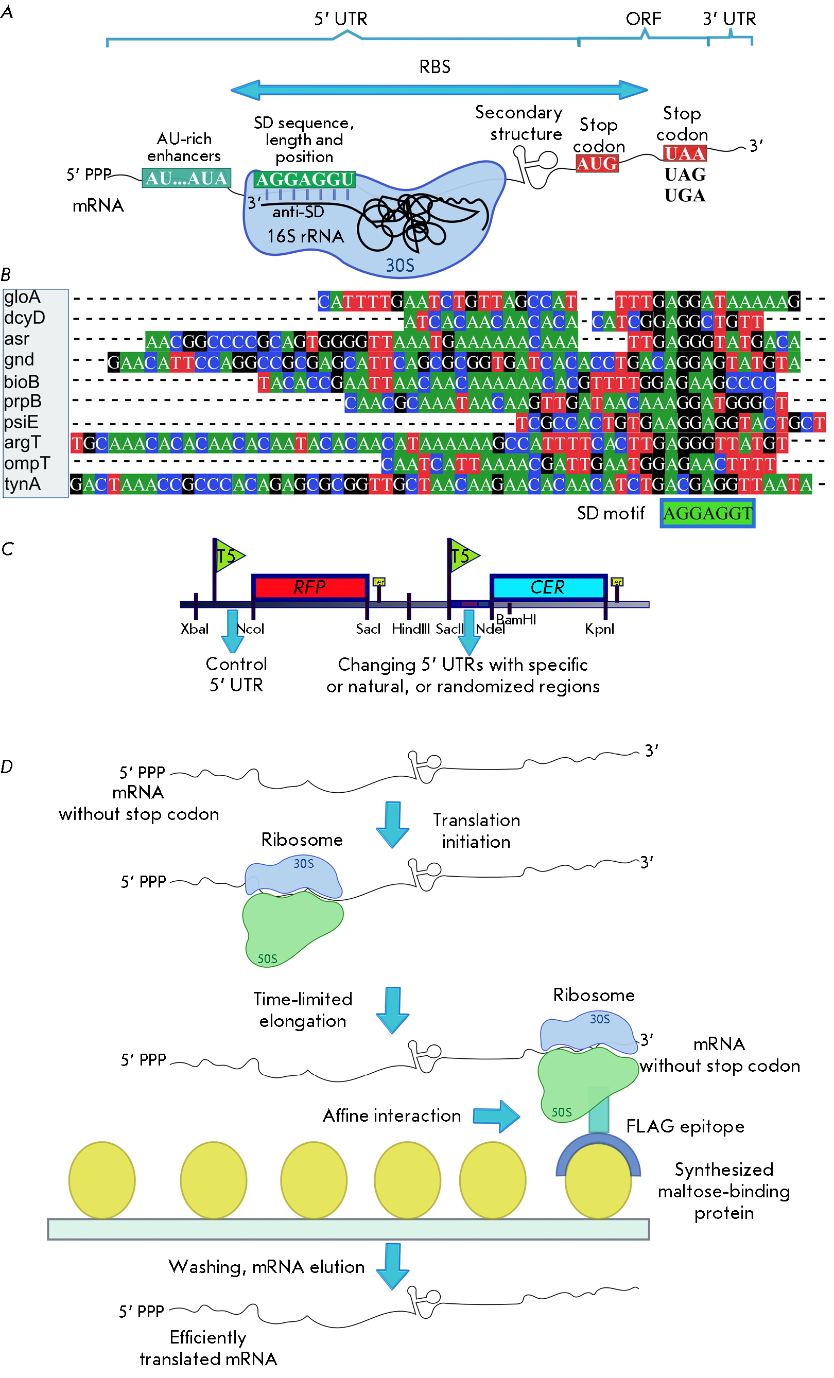 Одним из участков мРНК, определяющих эффективность ее трансляции, является 5’-нетранслируемая область (5’-UTR) (рис. 1А) [3]. В 5’-UTR находится сайт посадки рибосомы (RBS), содержащий в канонических мРНК последовательность Шайна–Дальгарно (SD) [4–13], комплементарную 3’-концу 16S рРНК [14, 15]. Для высокой эффективности биосинтеза белка SD должна располагаться на оптимальном расстоянии от стартового кодона и иметь оптимальную длину [16–18]. Иногда в одной 5’-UTR можно найти несколько последовательностей Шайна–Дальгарно [2, 17]. Для эффективной трансляции участок инициации трансляции (TIR) должен быть либо полностью одноцепочечным, либо укладываться во вторичную структуру, которую легко разрушить [19–22]. Известны и другие элементы, способные влиять на эффективность трансляции, такие, как богатая остатками аденина и урацила (AU-богатая) область мРНК, с которой взаимодействует рибосомный белок bS1 [23–25], а также начальный участок кодирующей области, следующий сразу за стартовым кодоном [26–28]. Для 5’-UTR эффективно транслируемых мРНК характерно низкое содержание остатков цитидина и наличие повторов с пуриновыми основаниями (AG-повторов) [2].