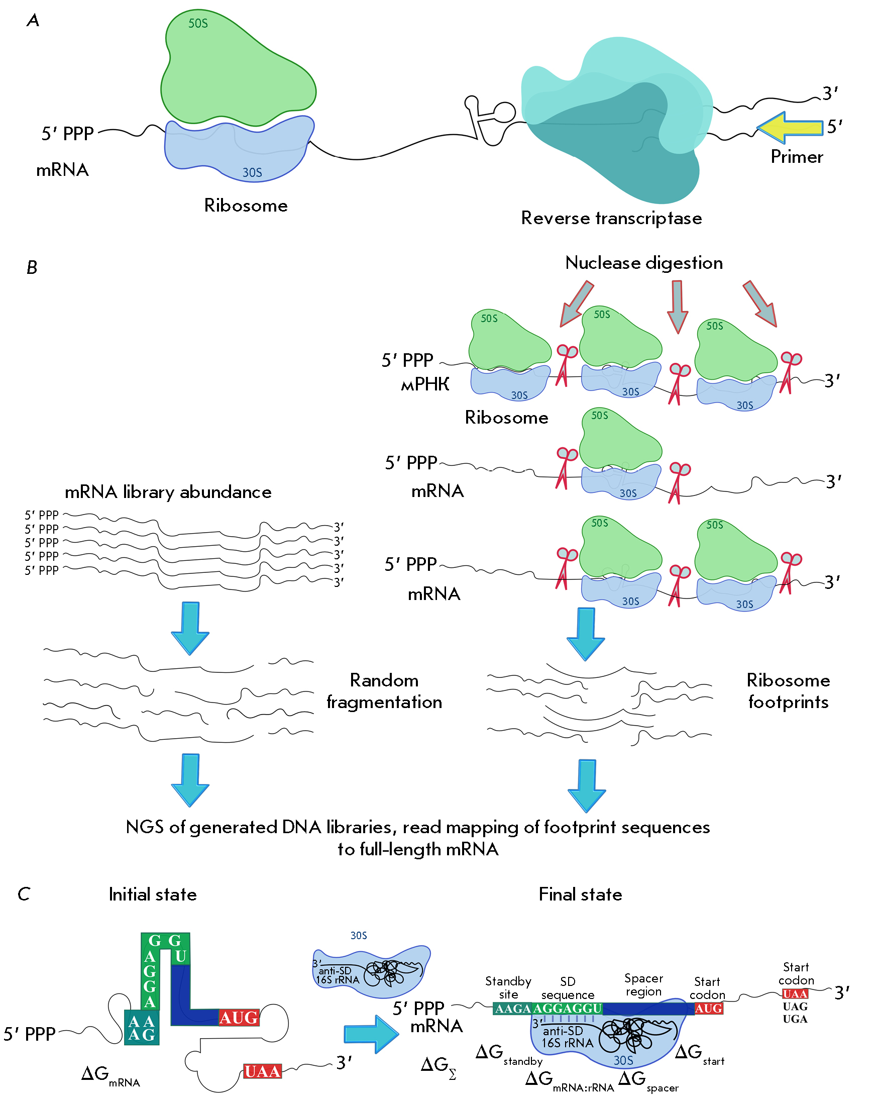 Рис. 2. А – принцип метода тоупринт. Стабильные рибосомные комплексы останавливают обратную транскриптазу на определенной позиции на мРНК, генерируя короткие кДНК-продукты определенной длины. В качестве праймеров для обратной транскриптазы могут служить радиоактивно или флуоресцентно меченные. Б – схема метода рибосомного профилирования/профайлинга (Ribo-seq). После инициации трансляции проводят разрезание мРНК в местах, где она не защищена рибосомами, специфичной нуклеазой. Параллельно готовят библиотеку исходной мРНК для секвенирования путем рандомной фрагментации. Она будет использоваться в качестве референсных последовательностей. Все полученные рибосомные футпринты используют для приготовления библиотеки ДНК, которую в дальнейшем глубоко секвенируют. По результатам NGS проводят картирование ридов последовательностей футпринтов на полноразмерную мРНК. В – термодинамическая модель бактериальной инициации трансляции. Изменение свободной энергии в течение стадии инициации определяется пятью типами молекулярных взаимодействий, определяющих начальное и конечное положение системы. Рисунок выполнен в программе Inkscape