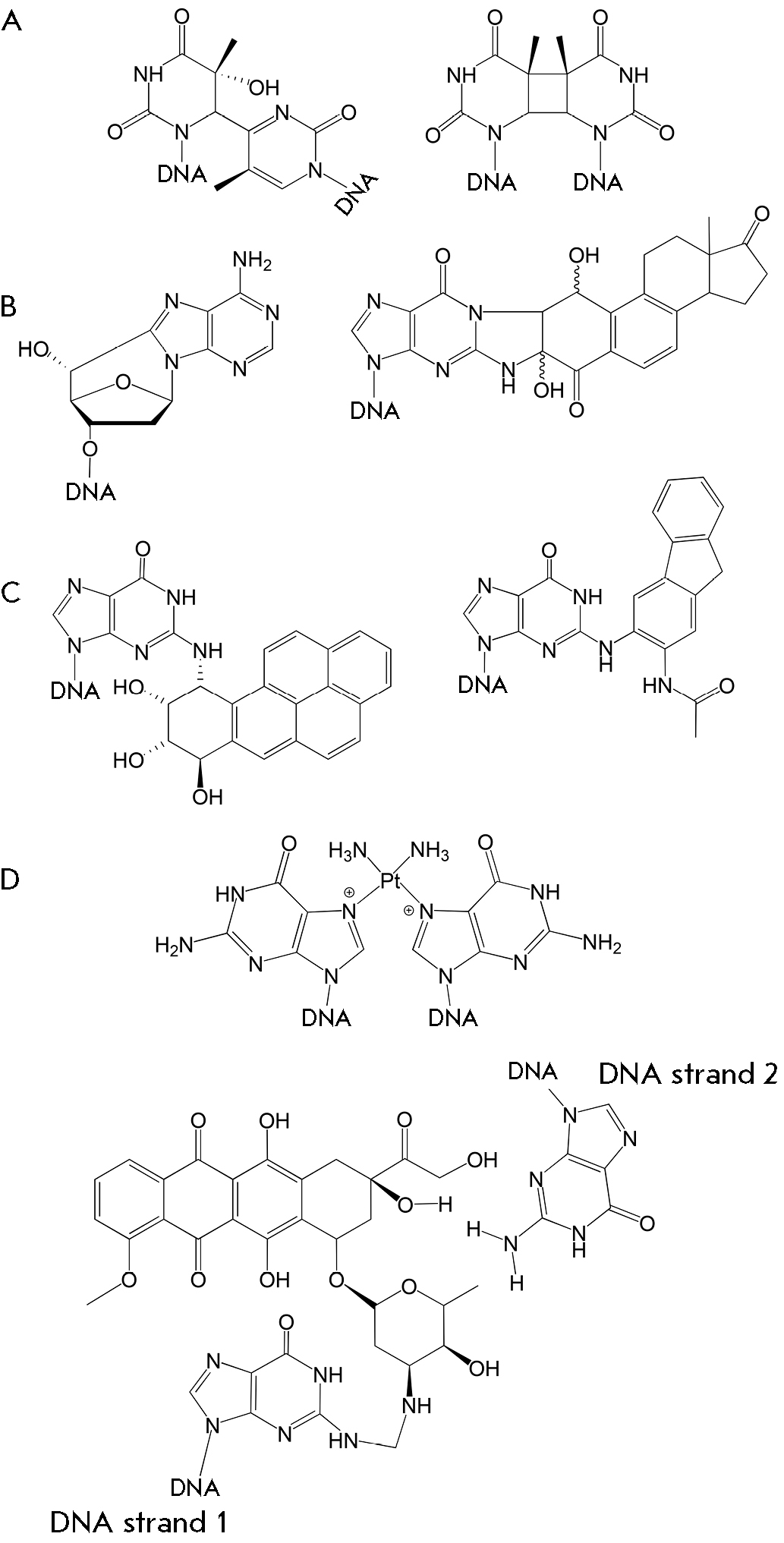 Fig. 2. Examples of DNA lesions removed by the NER system. (A) UV-induced lesions: a pyrimidine-(6,4)-pyrimidine photoproduct (left) and a cyclobutene pyrimidine dimer (right). (B) IR-induced lesions: 8,5’-cyclo-2’-deoxyadenosine (left) and a 4-hydroxyequilenin-guanine adduct (right). (C) DNA modifications induced by reactive environmental molecules: a benzo[a]pyrene diol epoxide-guanine adduct (left) and a (pyridyloxobutyl)guanine adduct (right). (D) Chemotherapy-induced lesions: a cisplatin-DNA adduct (top) and a doxorubicin-DNA adduct (bottom)