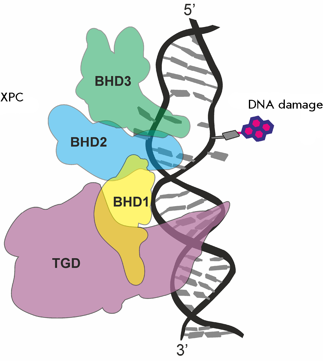 Fig. 3. DNA damage recognition by the XPC protein. DNA damage (pink), the transglutaminase (TGD) domain of XPC (purple), the BHD1 domain (yellow), the BHD2 domain (blue), and the BHD3 domain (green)