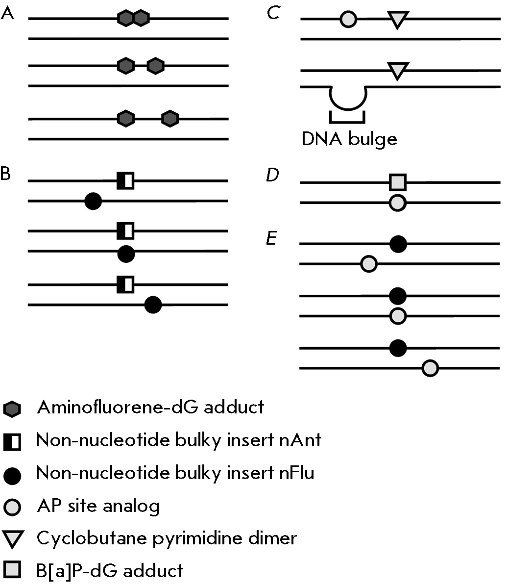 Fig. 4. Schematic of model DNAs containing clustered lesions. (A) Circular plasmid DNA containing fluorinated aminofluorene mono- or di-adducts separated by one or two nucleotides. (B) DNA containing synthetic bulky lesions in both strands: non-nucleotide inserts containing a bulky anthracenylcarbamoyl (nAnt) or fluorescein carbamoyl (nFlu) residue; the length of a model DNA duplex is 137 bp; the interlesion distance is ≤ 20 bp. (C) DNA duplexes (~200 bp) containing CPD and an AP site analog in the same strand or CPD and a bulge in the complementary strand. (D) A 135-bp DNA duplex containing a benzo[a]pyrene diol epoxide-guanine adduct and an opposite AP site analog. (E) DNA containing an nFlu bulky lesion and an AP site analog in the opposite strand; the length of a model DNA duplex is 137 bp; the interlesion distance is ≤ 6 bp
