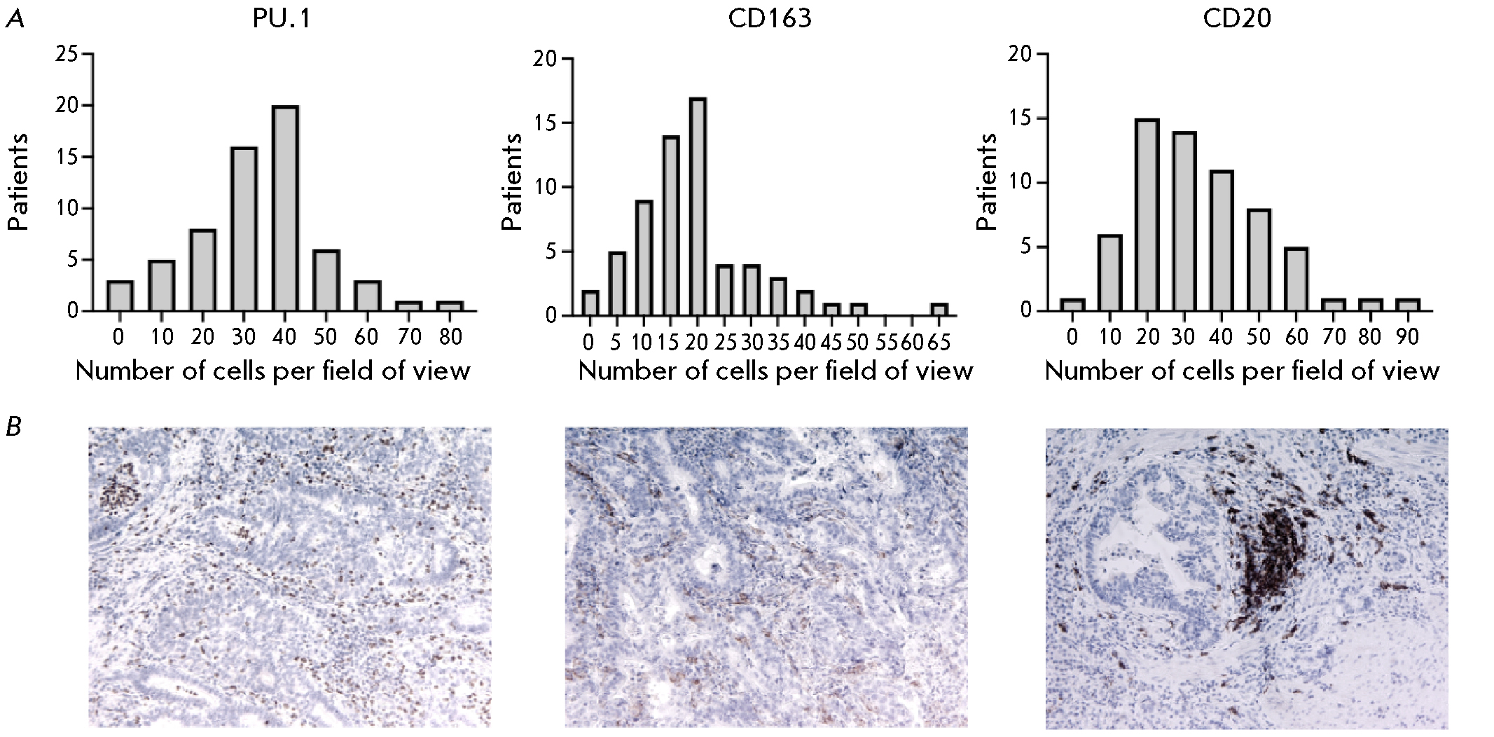 Fig. 1. (A) Distribution of PU.1, CD163, and CD20 in the stroma of the tumors of GC patients. (B) Immunohistochemical staining of gastric tumors using antibodies to PU.1, CD163, and CD20 (×100)
