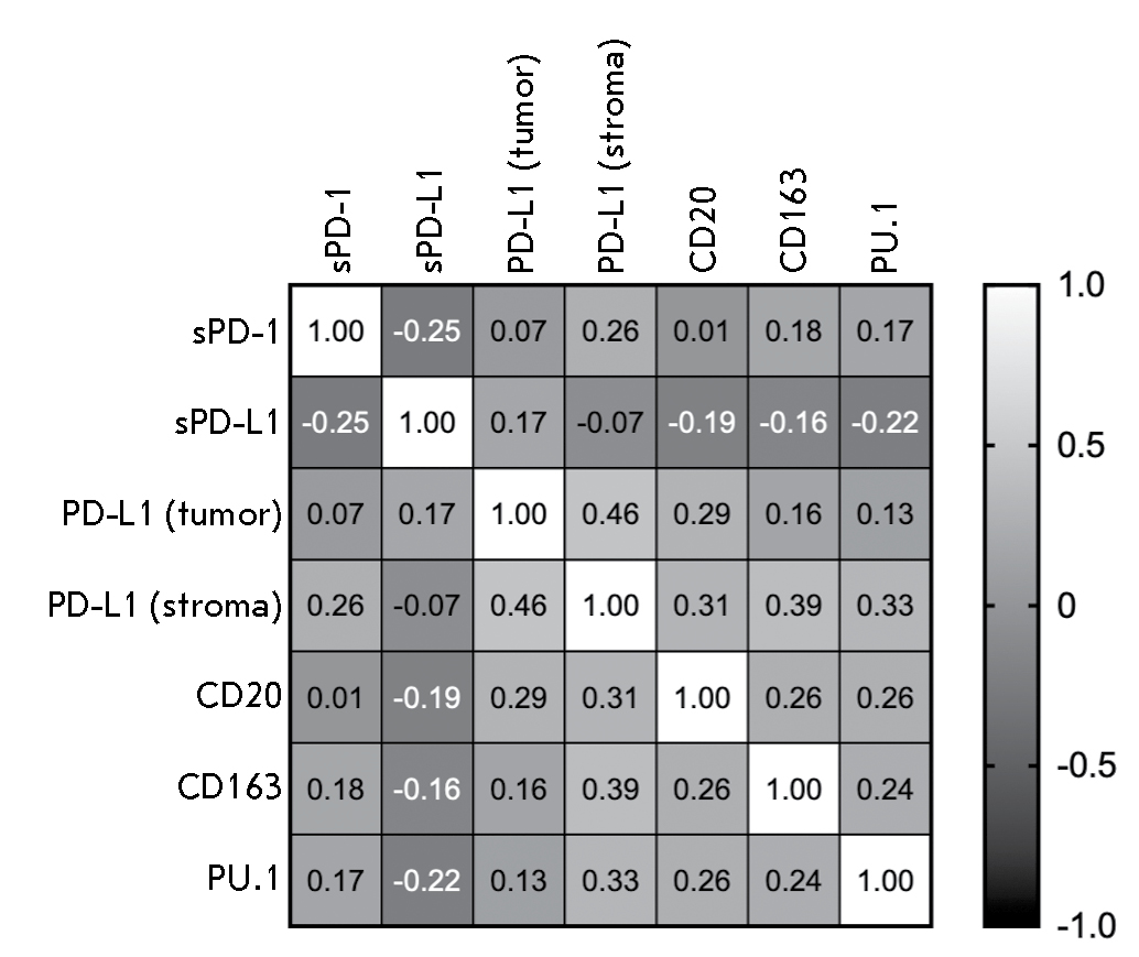 The analysis showed that the plasma content of the soluble form of the sPD-1 receptor inversely correlates with the plasma content of sPD-L1 and directly correlates with the tissue expression of PD-L1 in stromal cells (r = -0.251; p = 0.047 and r = 0.255; p = 0.044, respectively). Also, PD-L1 expression in the stromal cells of gastric tumors directly correlates with PD-L1 expression in tumor cells and the content of all stromal markers examined. A similar pattern was observed for B cells: namely, the content of CD20+ cells in tumor stroma positively correlates with both macrophage content and PD-L1 expression in both stroma and tumor cells, and this correlation was statistically significant.
