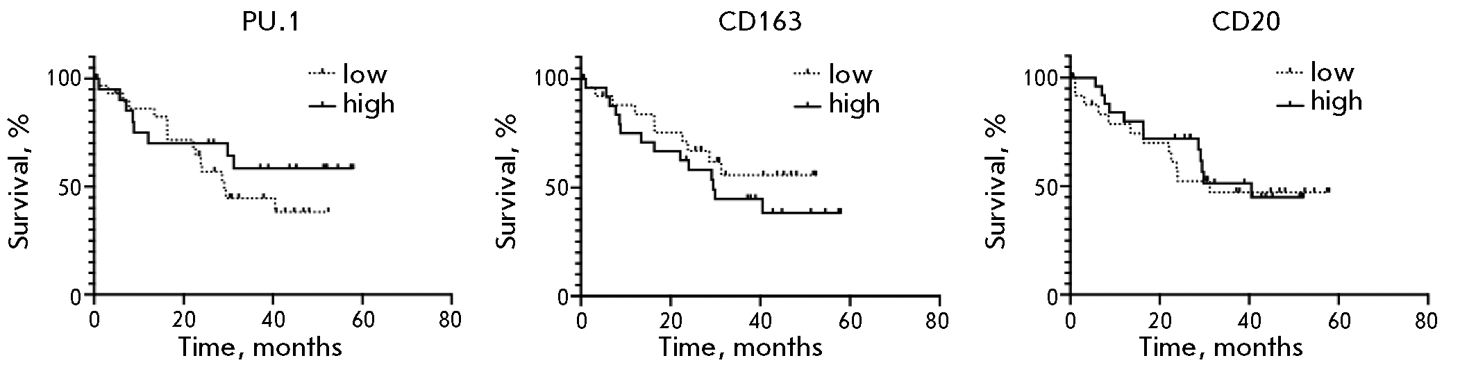 The data in Fig. 4 show that the studied stromal markers (PU.1, CD163, and CD20) are not prognostically significant in GC.