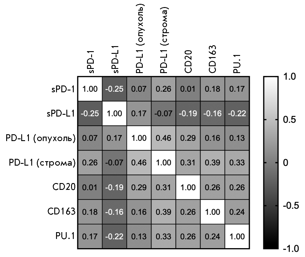 Рис. 3. Корреляционный анализ тканевых и сывороточных уровней PD-1, PD-L1, PU.1, CD163 и CD20 у больных раком желудка
