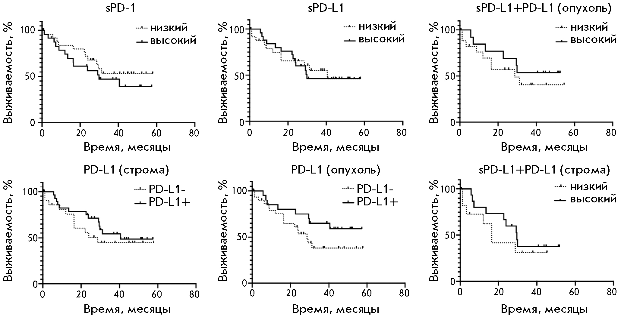 Нами проведен анализ прогностической значимости исследованных маркеров и их комбинаций у больных РЖ. Для анализа показателей выживаемости пациентов распределили на две группы: с высоким и низким содержанием растворимых форм маркеров относительно медианы. В случае тканевой экспрессии PD-L1 пациентов распределяли на две группы по наличию/отсутствию этого белка отдельно в опухолевых и стромальных клетках. Дополнительно проанализировали выживаемость в зависимости от комплексного содержания как растворимой sPD-L1, так и тканевой формы PD-L1. Графики выживаемости больных представлены на рис. 4.