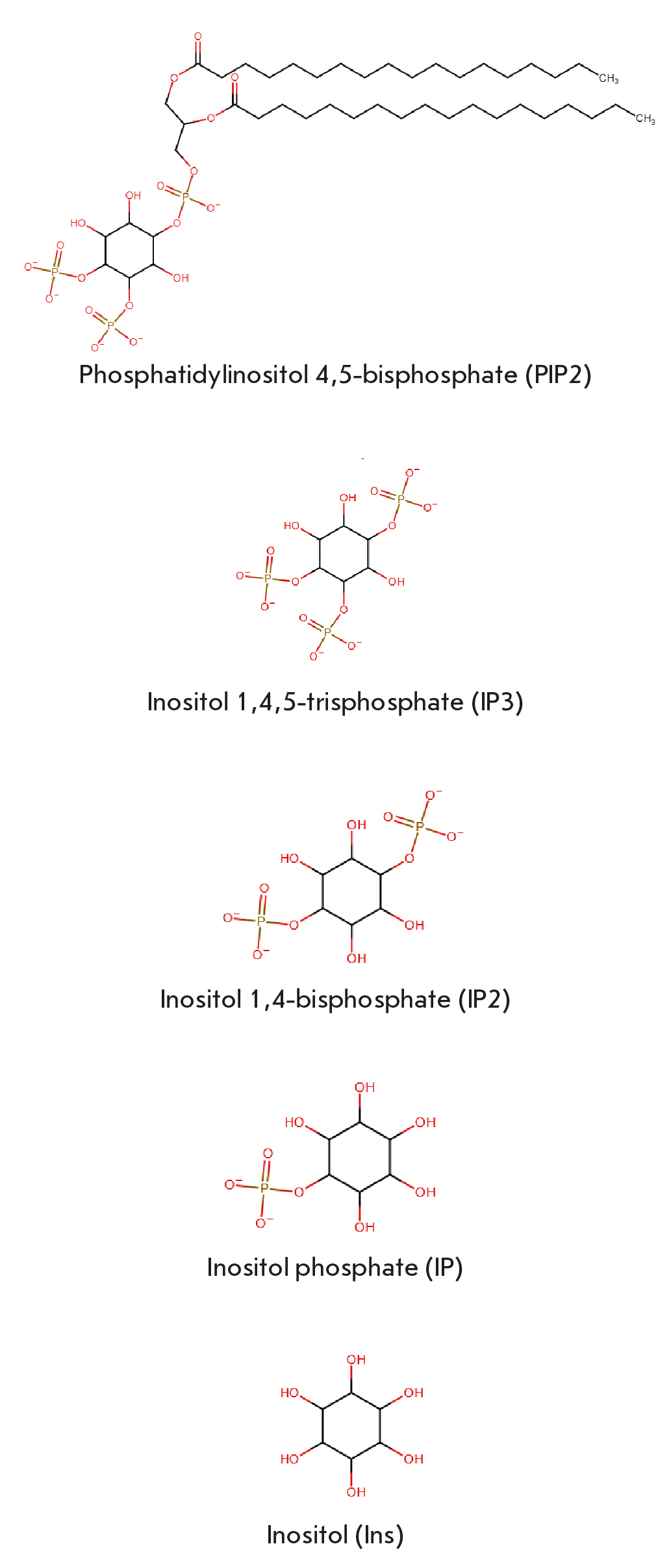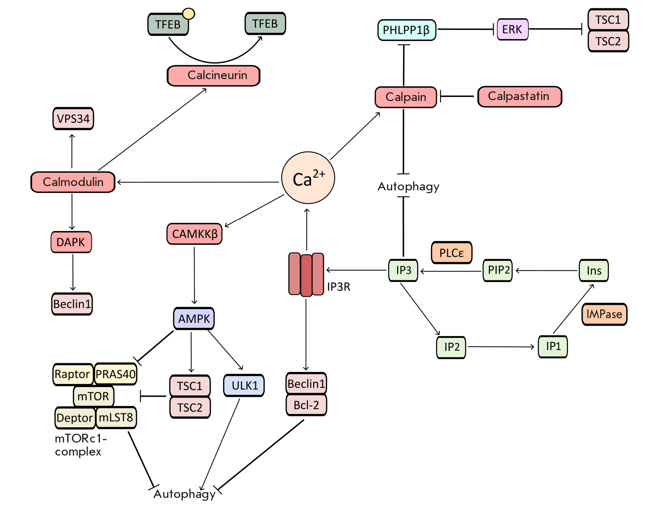 The calcium ion level in the cytoplasm is regulated by the activity of calcium channels, including IP3R. IP3R is an ER calcium channel; its function directly depends on the level of IP3, which opens the channel. Channel opening leads to calcium release from the ER into the cytosol. IP3R has an anti-autophagic effect, since it can inhibit the dissociation of the Beclin1/Bcl-2 complex, thereby reducing the level of active unbound Beclin1 in the cell. The PLC and IMPase proteins are involved in the regulation of the intracellular concentration of IP3; they convert phosphoinositol diphosphate (PI2P) to inositol triphosphate (IP3) and inositol monophosphate (IP1) to inositol, respectively. Inositol can be converted to its original state, PI2P [10].