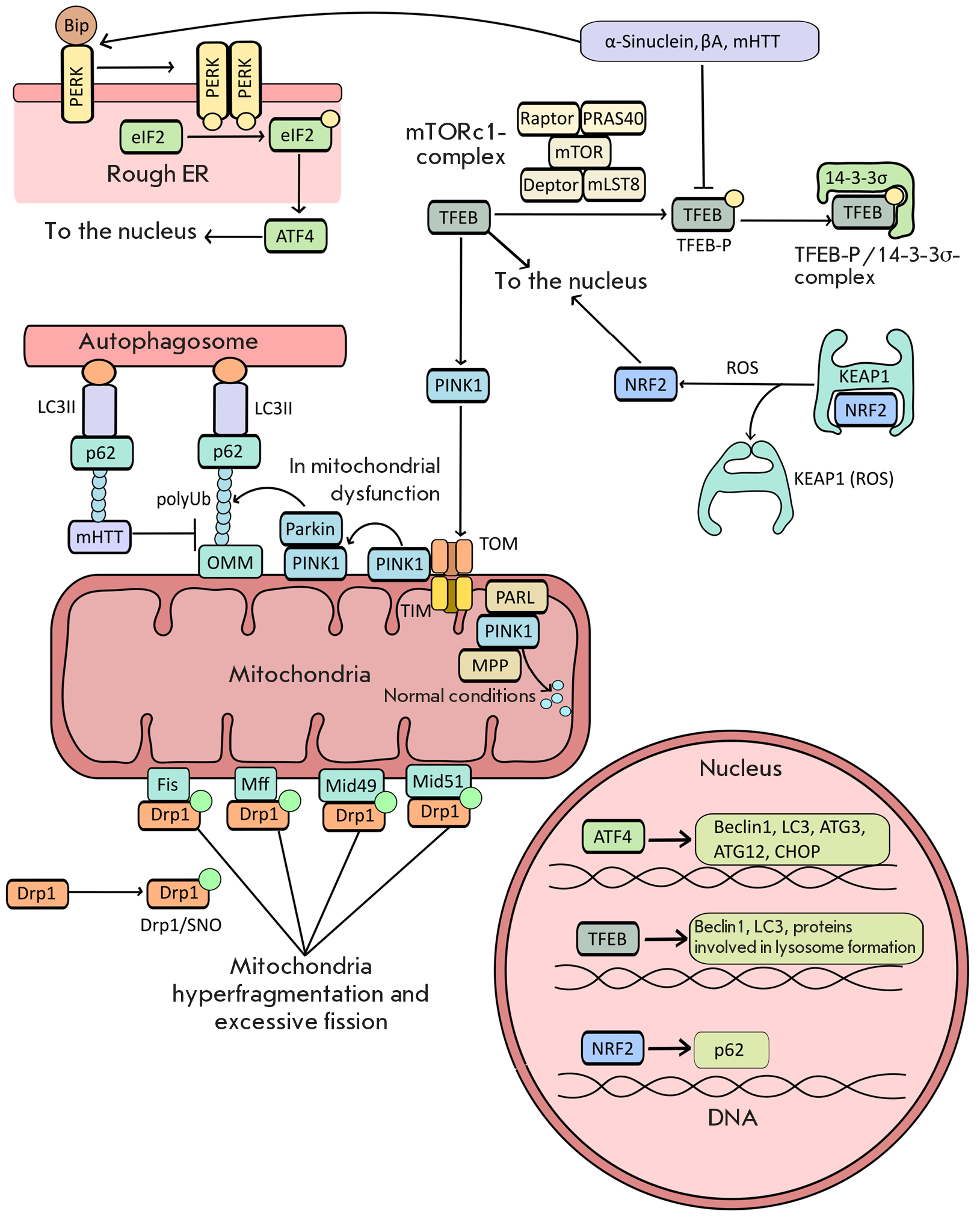 Autophagy impairment in neurodegenerative diseases is accompanied by the accumulation of lysosomes and immature autophagosomes in neurons. This phenomenon is associated with impaired inactivation of the TFEB transcription factor, which regulates the expression of many genes encoding autophagy proteins (LC3, Beclin1, p62, etc.) and the proteins involved in lysosome biogenesis.