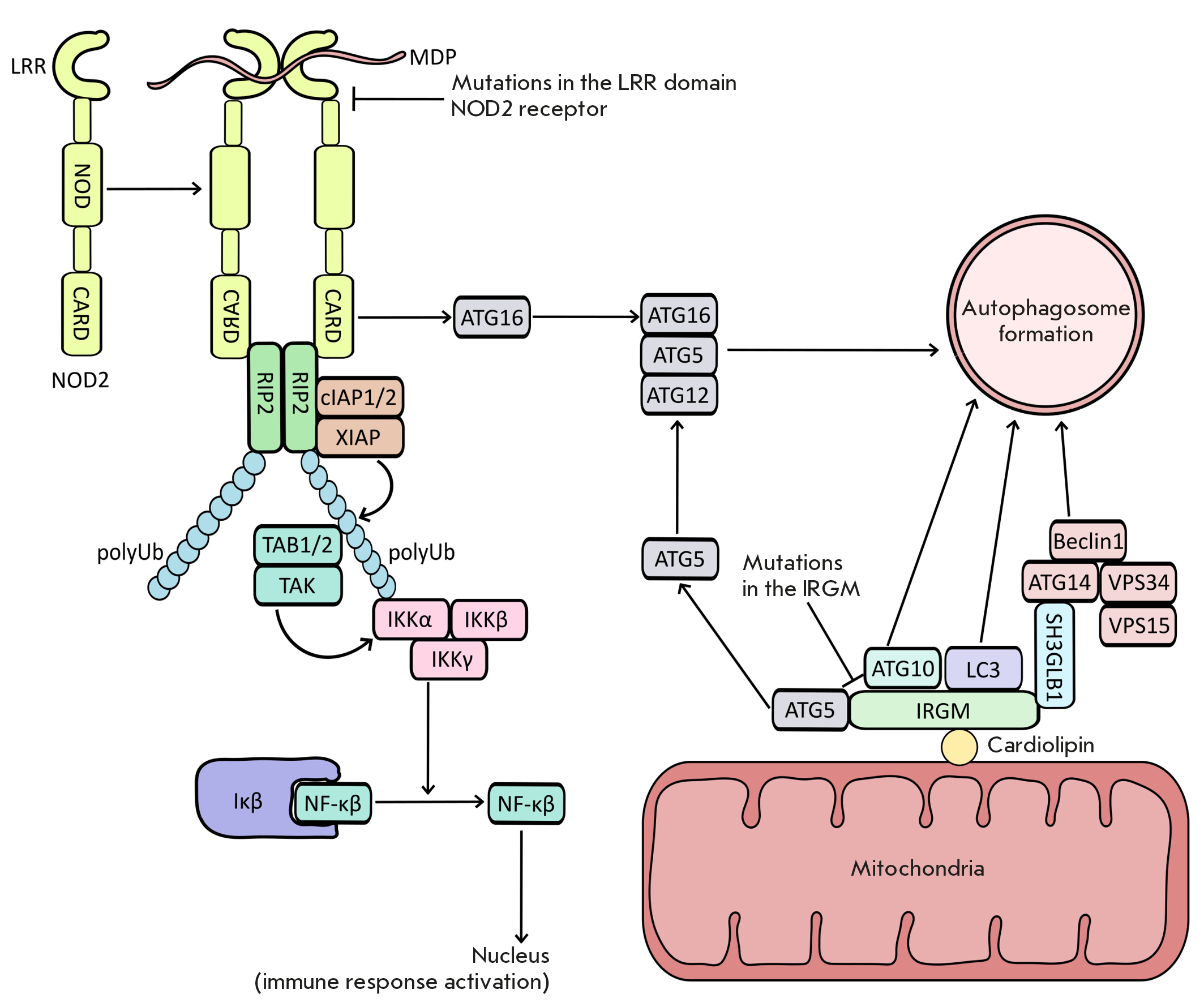 Fig. 4. Crohn disease and autophagy. Schematic presentation of intracellular receptor NOD2 activation and signaling pathways affecting autophagosome assembly and interaction with mitochondria (details can be found in the article)