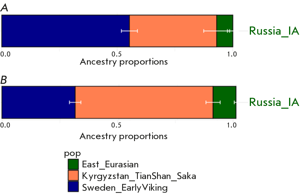 The hypothesis that the people from Bolshoy Oleny Island are one of the optimal proxy populations for four-ways admixture was tested by repeating the modeling that was performed by Margaryan et al [4]. Some Viking populations, such as Ladoga and Estonia_IA, could not be modeled as a mixture of three ancestral populations: European hunter-gatherers, Neolithic farmers, and steppe pastoralists (Table 1 of Supplementary 10). To achieve a successful modeling, a fourth source was added, which was represented by the eastern samples of the Xiongnu Iron Age (about 100 BC–50 AD) or samples of the Bolshoy Oleny Island. It turned out that the Scandinavian populations were modeled equally effectively (p > 0.05) using both the Xiongnu [4] and Bolshoy Oleny Island samples (Table 2 Supplementary 10). Their genetic contribution to these populations was as follows: to Ladoga – 4.7% Xiongnu and 4.7% Bolshoy Oleny Island; and to EstoniaIA – 6.5% Xiongnu and 8.4% Bolshoy Oleny Island.