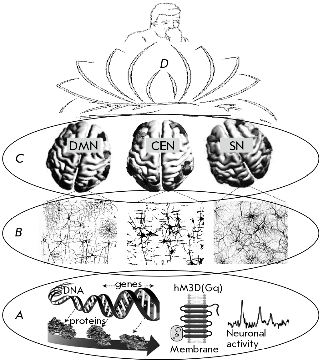 Fig. 1. Schematic presentation of the multilevel organization of brain functions in mammals. (A) – molecular and cellular processes, genes, proteins, cell membrane with proteins (as an example, the chemogenetic activating hM3D (Gq) receptor is presented schematically), and electrophysiological activity of the neuron. (B) – neuronal network ensembles of neurons interconnected through contacts, which form the basis of the structural and functional organization of the brain. (C) – large-scale brain networks, each of which emerged during evolution based on neuronal ensembles, which are presented schematically in (B), for predominant performance of certain adaptive functions by each of them. Pictures of the apical surface of the human brain show three large-scale networks: the default mode network (DMN), the central executive network (CEN), and the salience network (SN). The most important sections of each of the networks are shaded. Apparently, the interactions of DMN, CEN, SN, as well as a number of other large-scale brain networks, ensure cognitive and behavioral manifestations in an individual (D)