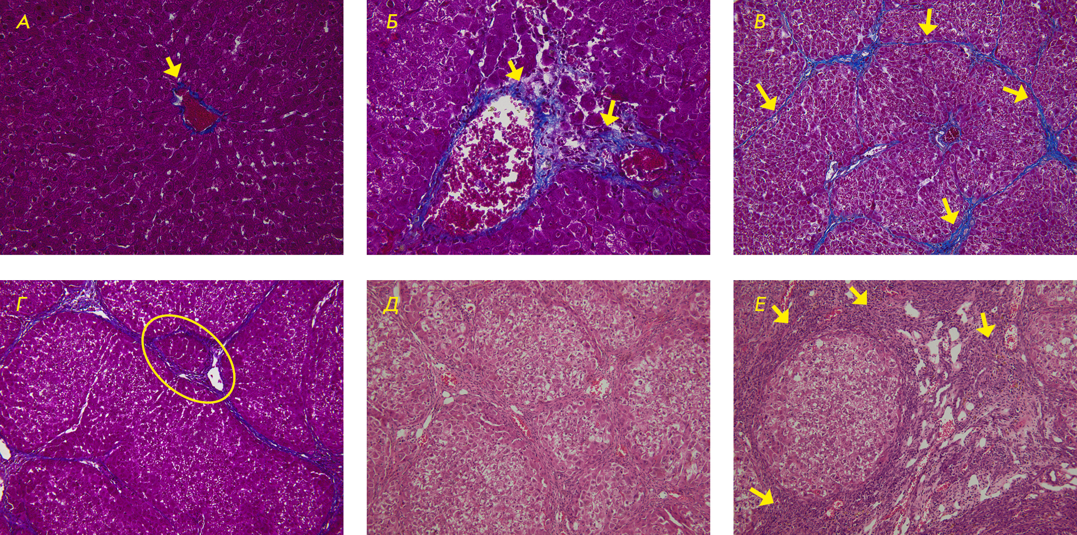 Рис. 1. Фрагменты печени крыс контрольной группы (А), через 3 нед. (Б), 7 нед. (В), 9 нед. (Г), 13 нед. (Д), 17 нед. (Е) после начала эксперимента. Окраска по методу Маллори. ×40 (А, Б), ×20 (В, Г). Окраска гематок- силином-эозином. ×20 (Д, Е). А – незначительное количество соединительной ткани в области центральной вены (стрелка); Б – соединительная ткань в портальной зоне (стрелки); В – соединительнотканные септы между портальными зонами (стрелки); Г – сформированная ложная печеночная долька (выделена овальной рамкой); Д – сформированные ложные печеночные дольки разной формы и диаметра; Е – резко выраженная деструкция органа, клетки лимфоидно-гистиоцитарного инфильтрата (стрелки)
