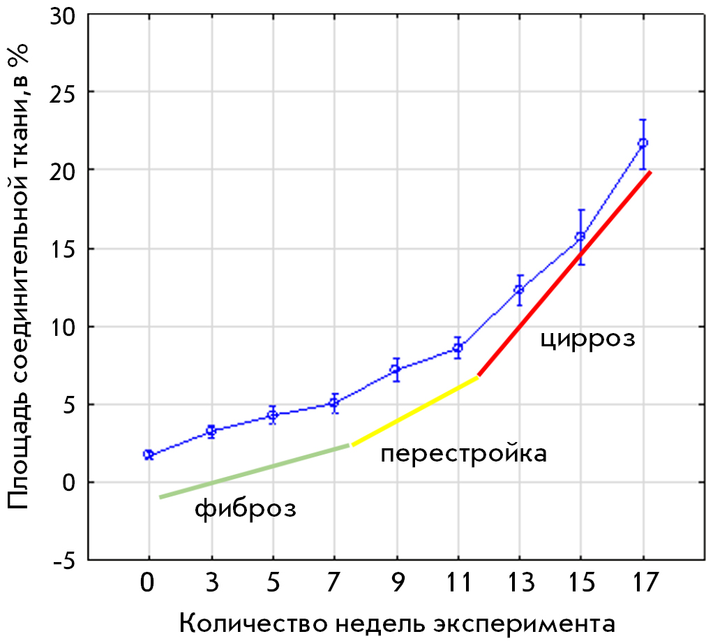 К 3 нед. эксперимента отмечали умеренное формирование фиброзной соединительной ткани в портальных зонах (F1, рис. 1Б). На 5 нед. процесс образования фиброзной ткани замедлился, но при этом она одновременно определялась как в портальных зонах, так и в паренхиме (мостовидный фиброз, F2/F3). К 7 нед. эксперимента интенсивность синтеза соединительной ткани сохранилась практически на том же уровне, как и на 5 нед. (F3/F4, рис. 1В). На этапе перехода от фиброза к циррозу снова наблюдали усиленное формирование соединительной ткани, аналогичное началу эксперимента (3 нед.). Через 9 нед. у портальных зон происходило образование ложных печеночных долек, что было морфологическим критерием начальной трансформации фиброза в цирроз (F4/F5, рис. 1Г). В период с 11 по 17 нед. разрастание соединительной ткани достигало максимально значения (F6, рис. 1Д,Е).