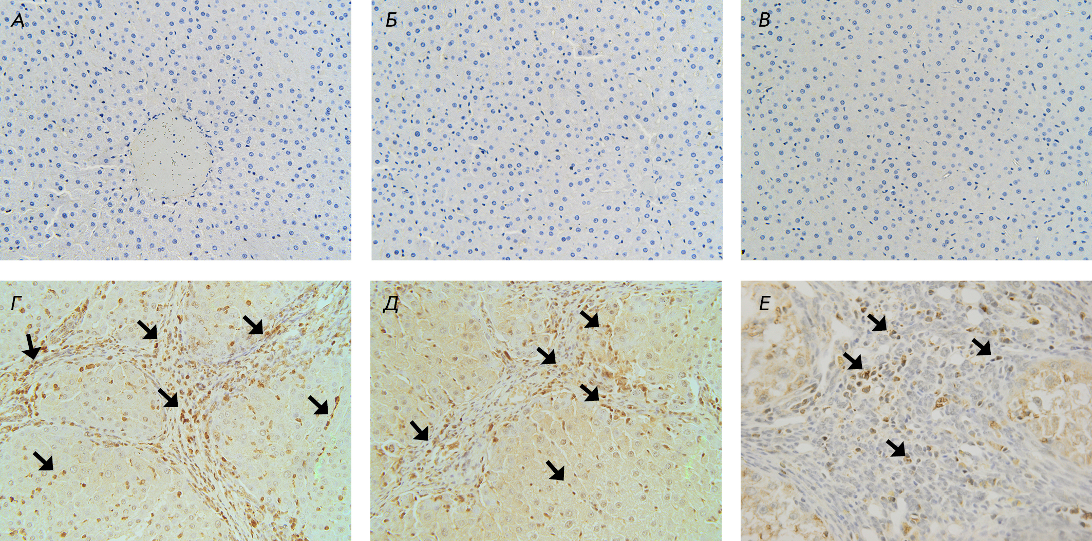Рис. 3. Фрагменты печени крыс контрольной группы (А, Б, В), через 15 нед. (Г, Д), через 17 нед. (Е) после на- чала эксперимента. Иммуногистохимическое окрашивание: на FAP – (А, Д); на α-SMA – (Б, Г); на CD45 – (В, Е). Докраска гематоксилином Майера. Увеличение ×40. А – FAP+-клетки отсутствуют; Б – α-SMA+-клетки в сину- соидах не выявлены; В – CD45+-клетки в паренхиме отсутствуют; Г – α-SMA+-клетки (стрелки); Д – FAP+-клетки (стрелки); Е – CD45+-клетки в соединительнотканной септе (стрелки)