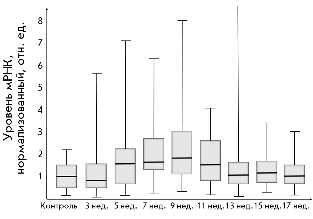 В анализ включили все значения, полученные в рамках исследования, не исключая «выбросов». Невысокий уровень мРНК MMP-9 отмечен в контрольной точке (интактные крысы). Интересно отметить, что к 3 нед. эксперимента на фоне развивающегося фиброза относительный уровень MMP-9 не увеличился и даже несколько снизился по сравнению с контрольным значением. В то же время уровень ММР-9 повысился на сравнительно небольшом промежутке между 5 и 9 нед. эксперимента с последующим снижением до начального уровня. На фоне роста экспрессии мРНК MMP-9 происходил процесс трансформации фиброза в цирроз. Начиная с 11 нед., уровень мРНК MMP-9 снизился и, в итоге, уже с 13 по 17 нед. соответствовал начальному в контрольной точке.