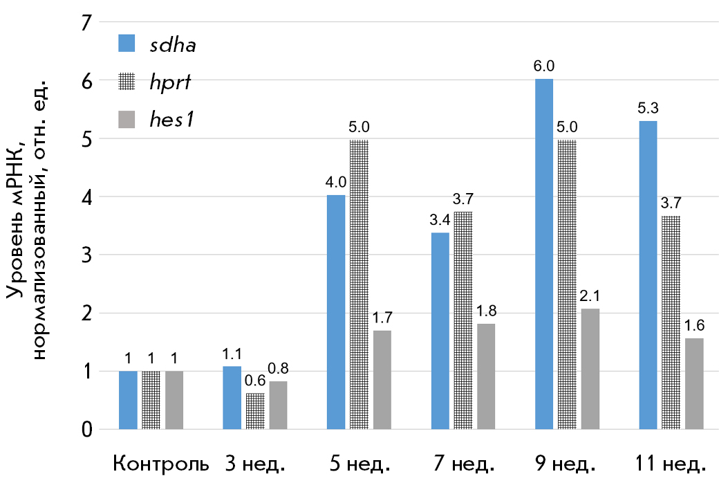 В качестве референсного гена для нормализации данных ПЦР-РВ выбрали ген hes1, поскольку уровень его экспрессии был наиболее стабильным на протяжении всего эксперимента. Использование генов hprt1 и sdha в качестве референсных признано нецелесообразным в силу высокой вариабельности уровня их мРНК. Эффективность ПЦР-РВ для мишени (MMP-9) и референсного гена (hes1) отличалась менее чем на 1% [25], поэтому относительный уровень мРНК оценивали с использованием стандартного метода K.J. Livak, T.D. Schmittgen [26]. Данные о нормализованном уровне экспрессии мРНК гена MMP-9 представлены на рис. 5.