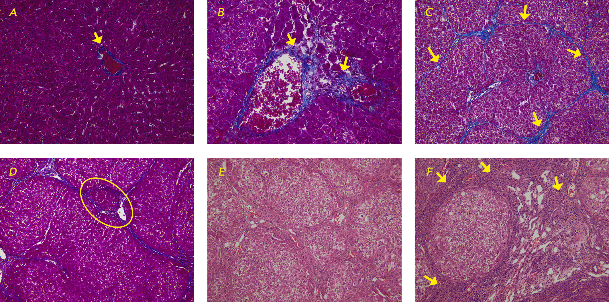 Fig.1. Fragments of the liver of the control group rats: (А) at 3 weeks, (B) at 7 weeks, (C) at 9 weeks, (D) at 13 weeks, (E) at 17 weeks, (F) before the beginning of the experiment. Mallory staining ×40 (А, B); ×20 (C, D). Hematoxylin-eosin staining ×20 (E, F). (А) – a small amount of connective tissue in the central vein region (marked with an arrow); (B) – connective tissue in the portal zone (marked with arrows); (C) – connective tissue septa between portal zones (marked with arrows); (D) – neoformed false hepatic lobule (marked with an oval frame); (E) – neoformed false hepatic lobules; (F) – pronounced liver destruction with clearly visualized lymphoid-histiocytic infiltrate cells (marked with arrows)